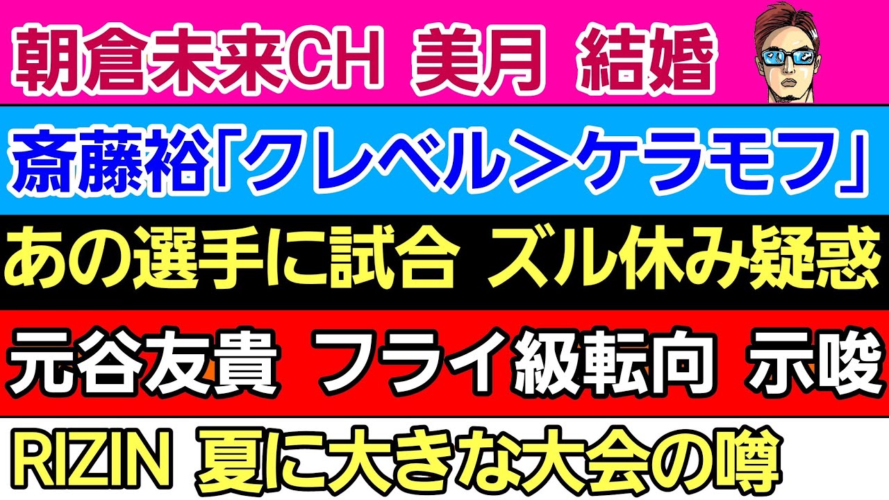 〇朝倉未来CH 美月 結婚〇斎藤裕 「クレベルのがケラモフより強い」〇元谷友貴 フライ級転向示唆〇安保ルキヤ×西谷大成 仲間になる〇あの選手に試合ズル欠場疑惑〇RIZIN 夏大会開催の噂