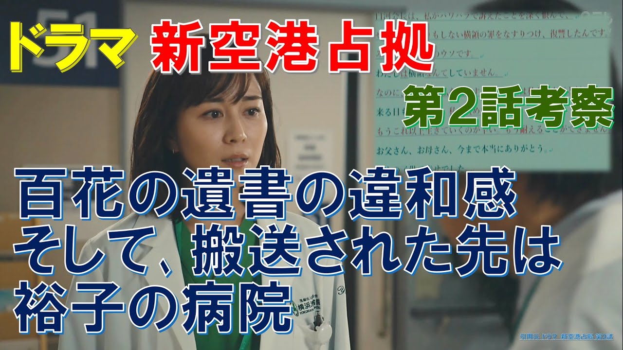 ドラマ【新空港占拠】第2話考察 百花の遺書の違和感、そして、搬送された先は、裕子の病院【櫻井翔、比嘉愛未、ジェシー】