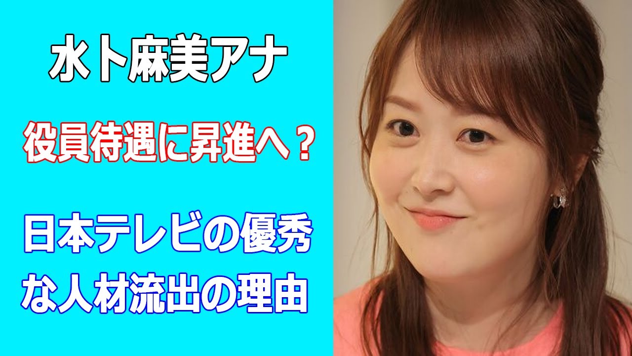 以外にも複数の特番の司会を任されてい ますそのため日本テレビは水国美アの フリー転身だけは何としてでも防ぎたいと 考えているとどいそして今夏から実施する 人事制度の改革によって水木穴が役員など に昇進する可能性が高いと見られるといい 例えばPBSのエースあみ新一郎穴は昨年 7月に総合編成本部アナウンスセンター役 引退部エキスパート職江戸小心彼の年収は 一説には奥こえとさかれていますテレ朝の 大下洋コ穴も2020年に役員大風に昇進 2人とも現役アナウンサーありながら役員 体部となりしっかりと報酬を受け取って いるわけです水木穴の貢献度を考えたら 両者にも引けおっていません今夏の制度会 覚悟早々に役員や役員体部に昇進する なんてことも十分に考えられそうですとし ています日本テレビは2019年6月の 人事で同局のエースだったマスタ1穴と 水木浅穴を揃って昇進させマ穴は アナウンス部の副市人から主任課長体部木 穴は福死人副課長タグに昇進しましたその 後マスタ1穴が2022年3月を持って 代謝してフリーに転身し水木美穴が死人と なっているようでこうした人事の背景にも フリー転身を阻止する目的があるなどと 週刊誌などに報じられていました水木美あ 自身は金手から日本テレビアをアピールし フリー天新設をきっぱりと否定しているの ですが水木穴の活躍ぶりから役員や役員へ の心は当然かと思います小心簿には曲が さらに水木み穴を酷使することが懸念され ますが今も仕事料も調整し少しずつでも 負担を減らすなどの対応も取ってもらい たい です