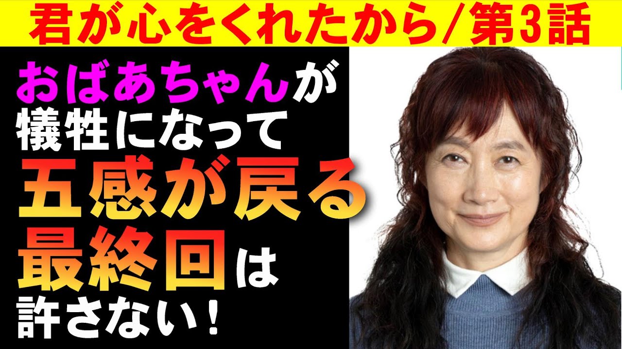 はばと互換失わせてそっから先の ストーリーをだけどなかなかそれ互換失っ た状態でストーリーを展開させるってま 無理だと思うんでもうお話になんないから ま多分1つ2話について1つの感覚を2話 ずつで描くみたいな ねでもそのにね想感がないしでもあれです よねおそらく 資格とか聴覚失ったありだともう味覚が ほとんど相手にされないんじゃないね資格 とか聴覚を失ったぐらいになると味覚とか 嗅覚とかがもうもうもう全然なんていうか 無視されるっていうかね [音楽] うんなんかとにかくね全体的にねそういう 意味でもバランスが悪いんですよねうん こう想感がなんていうかこう怒ってる現象 に対してに対してなんか想感がねこう 見合ってないみたいな感じがしてまこれ からどんどん悲劇になってくんでしょう けどもうこの感覚がね失ってくにつれて前 の方の感覚がまそんなに相手にされなく なるみたいな展開になりそうでねはいまで も最終回ですよねさあどんな救済が待っ てるんですかねうん多分ねえ日坂さんがね 太陽か何かに えー身代わりになるとかなんかそういう こと言い出すんでしょうね身代わりになる とかうんでも最後はきっと雪野さんが私が 全てをねもうどうせ追い短いんだし病気だ し私が全て背負っていくわみたいな感じで えまおばあちゃんが多分あの犠牲になるん でしょ自己犠牲を払ってえ彼女はまた互感 を取り戻すていうね多分そのためのねお ばあちゃんだと思うんですよねおばあ ちゃんありがとうみたいなねでもまおばあ ちゃんってま結局なんだろうもう先短いし ま今老人ってほらね若者を犠牲にして年金 とかでうろってるじゃないですかそんな 老人がたまにはお前お前らちょっとねお じいちゃんおばあちゃんあの犠牲になって よ的な感じで若い人たちが見てるドラマだ からおばあちゃんが犠牲になってもうんま いいんじゃないみたいなねまそれが一番 こう落とし所としてはね丸く収まるという かま納得のどになると思うんでラストは おそらくおばあちゃんが全てをね え背負ってあのま命を失ね背負ってま死ん でいくその代わり彼女の互感は取り戻され るっていうねまそういう展開になると思い ますけどねまそこら辺が一番落とし所とし ては確実でしょう例えばじゃあアちゃんの 互換を戻すためには太陽が命を落とすとか え互換をね太陽がじゃその互換互換失うの ね太陽が肩代わりするとかだとまこれ本末