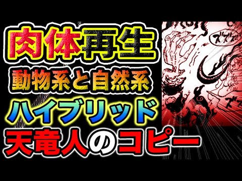 目も属性も能力も多し多様ですこれらを 全て天竜人が作ったとは思えます ましてバッカニア族とルナーリア族は天竜 人にとって抹殺対象ですなおさらありえ ないでしょうしたって仮に作っていたとし ても人間だけだと思うのですがまさか大昔 の天竜人は自分たちの奴隷として自分たち のコピーである人間を作ったのでしょうか そうだとしたらDの一族とは何者だったの でしょうかDの一族を倒した20人の王は 人間ではなかったのでしょうかここはもう 少し時間を取って考察を深める必要があり そうですサターン星の再生 能力サターン星はクに殴られてぼぼになっ ていたのですがなんといきなり肉体を再生 させてしまいました失った角と片がよく わからない不気味な力でずずずと生えてき たのですサジはおいなんで再生すんだ あいつの体と叫んでいました間近で見てい たサジにも一体どうやって再生しているの かさっぱりわけが分からなかったようです 私は昨日の動画でサターン生は普通の生物 ではなくロボットではないかと予想しまし た流体金属のようなもので体が覆われてい てそれらが損傷した部を自在に再構築して いるのではないかと思いましたただ仮に そうであるならば出血はどう説明すれば いいのでしょうかもし機械的あるいは金属 粒子的な構造で肉体が構成されているので あれば出血があるのはおかしいです血液を 全身に巡らせる必要がないからです パシフィスタやセラフィムのようにベース がクローン人間で生物の構造を持っている のであれば血が出るのは当然なのですが 完全なロボットであるならば出血はありえ ませしってサターン星は何らかの生物で あることは間違いありませんおそらく ルナーリア族のような肉体を再生できる 能力を持っているのでしょうそうとしか 考えられませんとはいえあのような何も ない空間にまるでロギア系の能力者のよう に肉体が再生するというのは一体どういう 理屈なのでしょうかサターン星は明らかに ゾ系の能力者だと思うのですがまさか ロギア系の能力も持っているのでしょうか しかしロギア系だとしたら先ほどの話と 同様血液が流れるのはおかしいですロギア 系の能力者は覇気で攻撃されない限り出血 することがないからですひょっとして ゾーン系とロギア系のハイブリッド系なの でしょうか黒ひげみたいな肉体の持ち主な のでしょうか現時点では情報が限られて いるのでするしかないのですが人間の ルーツも含めて今後重大な真実が明かさ れるかもしれません木が泣きながら戦って