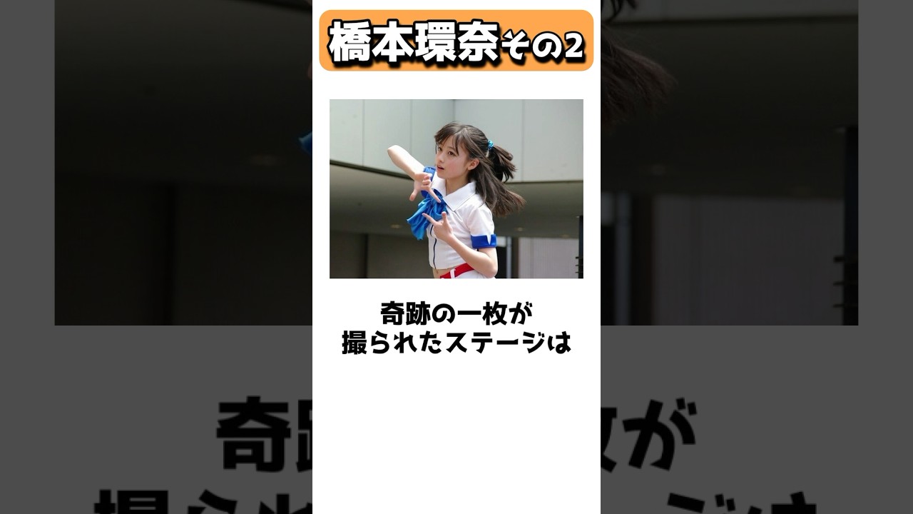 橋本神奈は双子の兄がいるデビューの きっかけは8歳の頃テレビに出たいと母親 に頼み地元福岡の芸能プロに所属した地方 CMがメインだったがステージに立つのも 楽しそうだと思い2009年アイドル グループのレブフロムDVLに加入した コダ監督の映画奇跡に出演劇団の舞台や 地方ドラマ出演など徐々に活動を広げ 2013年5月博多リバレインで開催され たライブでファンによって撮影された1枚 の写真が11月になって突如SNSや掲示 板で爆発的に広がりこの美少女は誰だと 話題になった連日テレビで取り上げられ 千年に1人の逸材として橋本神田の名前は 全国に知れ渡った撮影したのはアイドル ファンでカメラ小僧の博多のたさんライブ レポと共にブログに掲載していた奇跡の1 枚が取られたステージは身長を理由に メンバーから外されており社長に直談判し てステージの橋で踊らせてもらっていた 根性から生まれた奇跡の1枚だった