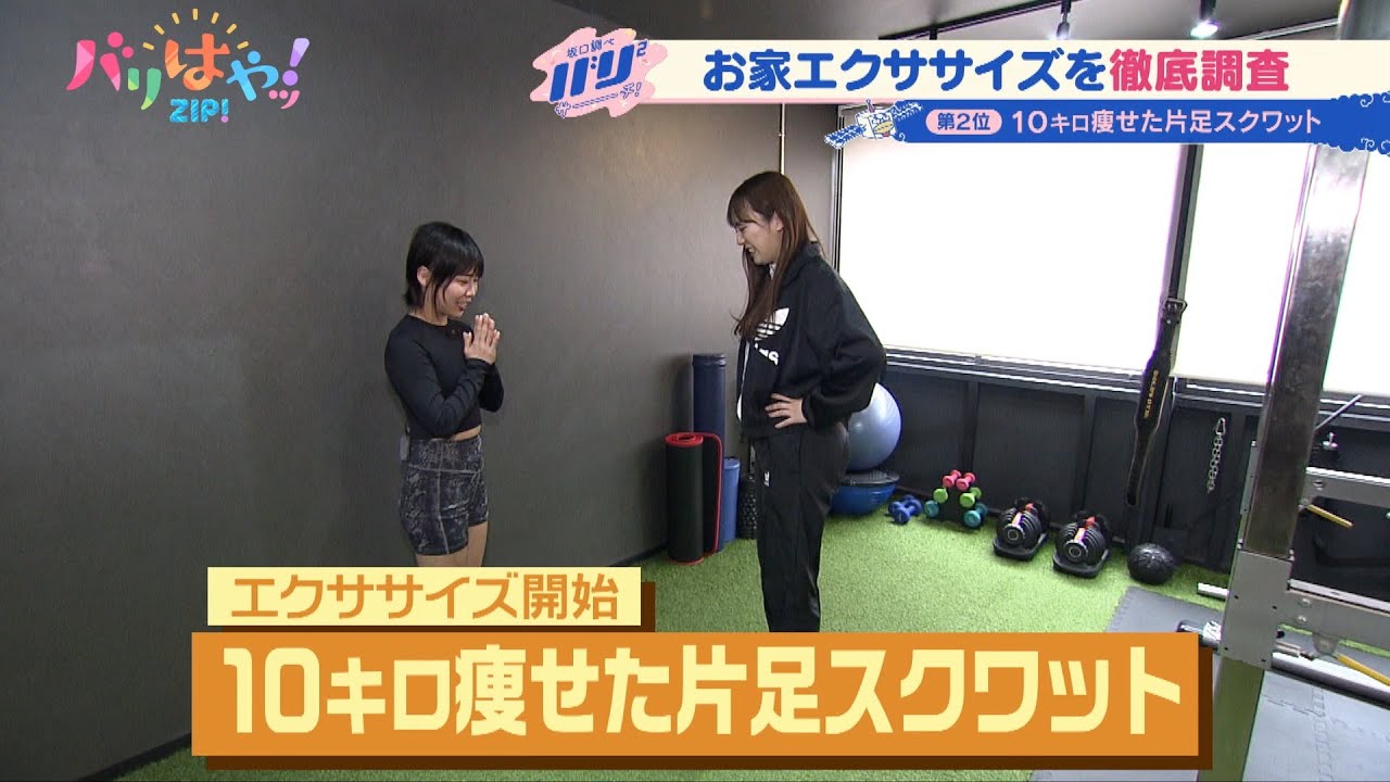 ちょっと2024年はもっと美しくお正月 に食べすぎてしまった人もまだ間に合うお 家でできる簡単エクササイズを体を張って 徹底 調査赤口調べバリバリ サーチ今回エクササイズをご紹介して いただくのは福岡でナンバーワンの店舗数 を誇るパーソナルジムボディハッカーズ ラボの トレーナー レー南さん今日は私HKT時代の トレーニングウアでやってまいりました 今日は本気で休に来たんでよろしくお願い しますよろしくお願いしますお願いします 頑張っていきましょう頑張ります本気です 頑張りたいです本当 にん のしをスーパーボディコンテストで日位に 輝いた実の 持ち主今回はそんなボディトレーナーが 教えるお家でできる簡単エクササイズ ベスト3を発表していただきますさあまず 第3位 は第3位は小顔ショルダープレスです小顔 ですかはいありがとうござい ます簡単水を入れたペットボトルを肩から 頭上に上げるだけ1日15回3セットを 目標にレッツエクササイズ三角筋を鍛える ことで相対的に小顔に見せてくれる効果が そ関係あるんだそれではりこん頑張って いきましょうはいはいはいそれでは行き ますいきますせーの1 はい はいですよ はい角のメがポイントですたい [拍手] ラストオーすい 上手きついきつい続けるとどんどん行き ましょうボディトレーナーが教えるお家で できる簡単エクササイズ第2位は第2位は 南が10kg痩せた片足スクワットです 10kg10kgこれやったら10kg ですかそうなんですボディメイクを始めて からトータルで10kg痩せることができ た時に1番頑張って取り組んでいた トレーニングの1つです ええこちらも超簡単な エクササイズ1日15回3セットを目標に 片足でスクワットをする だけ太ももの筋肉が体の中で1番大きな 筋肉なんですこの筋肉を鍛えることで代謝 が良くなり痩せやすい体作りができるん ですこのやり方ならでき絶対に10KG 痩せますお願いしますそれではいきますせ のねこのままでいですそうですねあきつい