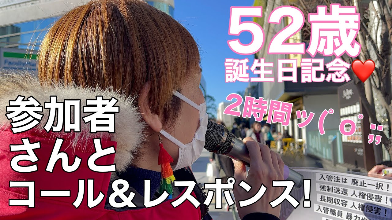 さんが多いかもしれないんですが今日の皆 さんはそういった団体さんじゃなくてもう 本当に市場の人々の1人1人の集まりで 自分たちでこう手探りででもを開催すると いう状態だったそうなんですねでそういっ たところにまお招きをいただけてあのま私 の選挙の時にもすごく応援してくださる方 が主催の主要メンバーの1人だったので 恩返しの意味も込めて参加してきました もう喉今日喉枯れてるでしょあのコーラー も務めさせていただいてあのねもう あんまりうまくできなくてまあケンティが そんなことなかったよって言って動画撮っ ててくれて見てもま確かにそうなんかあの 悪くはなかったと思うんだけどもあの期待 されてた以上のパフォーマンスはできて なかったなってすごくなんかこう悔しいの でまたこう回を重ねて自分のコーラとして のこうスキルとかも上げていきたいと思い ますで街の人々の反応がすごくますごく 良くてというのか分からないけどでも時々 あの拍手してくれたりあのラブラブマーク 送ってくれたりしてくれてねすごく 嬉しかったしあと1番感動したのが表参道 でこうみんなでわーっと歩いてる時に車に 乗ってるあのブラックフェイスの方が運転 してらしてその方がありがとうありがとう て俺たちのためにありがとうって言って くれたんだよねそれがすごく嬉しかったあ 伝わってるなって あの嬉しかったですでまみんな私たち日本 人ってシャイな方も多いのであのみんな見 て見ぬふりしてるけどでも本当はすごく 興味を持ってくれてる人もいるだろうし マイクを持ったあの主催者のメンバーの方 が皆さんあの後で入間って入間法解約とか 入間っていう言葉を入れてググってくださ いっていかに今日本の政府が外国の方に 対してひどいことをしてるか収容施設で何 が行われてるか人の命まで奪われてるか奪 てれてんだとそういったこと知って もらえると思うから調べてくださいって 一生懸命訴えててだからそういう言葉が耳 に届いて後であの自分の時間のある時に索 してくれたりしてこうしたことを知って くれるのかなと思いますそういったことの 1つ1つの小さなことの積み重ねが社会を 変えていくことにつながると思うので すごく意深い時間を過ごしました自分の 誕生日にデモに参加させていただけるって 本当に嬉しかったですえほっちさん本当に お招きありがとうございましたああそう ですねでしかもねあのこの配信とかそれ からうん見てくれてる人とかSNSの発信 で知ってきましたって言ってくれる方も何