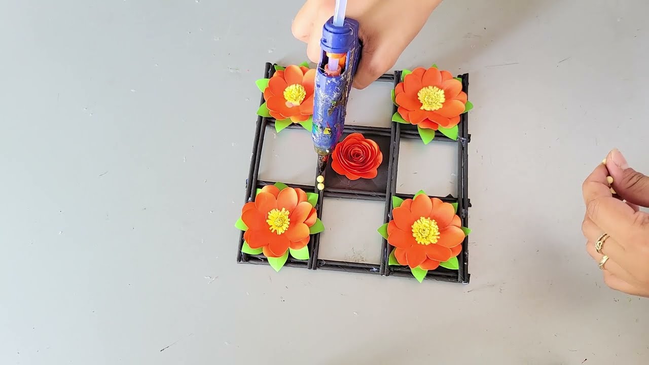 Giấy này lại với nhau bằng cách là mình sẽ cần cho keo lên trên cái phần điểm bề mặt của phần que giấy như thế này nhá sau khi mà đã cho keo lên đây rồi thì mình sẽ đặt lên và Như vậy là mình đã hoàn thiện và