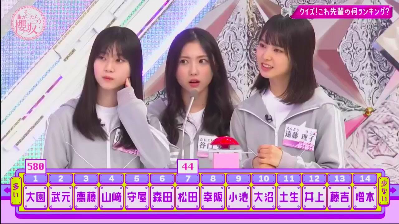 残った1人がおバカ女王問題お願いします 問題英文など横書きの分のを終わりに打つ 点をうわ押したのは 大沼ピリオドうわ 正解大沼 かけちょちょおいすご面白面白い映像す すごいこと起きた自分でこえてけって言い ながら ピポンそんな高度な技をそれは見たこと ないわということで桜坂46おバカ嬢は村 に 決定おめでとう 小田とかどうどう感じてんのでもみゆは 普段から結構あれって思うことが結構ある のでみんな頷いてるけどだから私たちは 多分納得です納得なんかそのいやミは他に もっといいところがある から思ったにき思落てそんなことないよ他 のがいいのかなと思って みんそうそう納得ですみたいなや だ松本大丈夫 毎回そこまった 桜坂さ今週も始まりましたそこ曲がったら 桜坂しかのサトですお願いしますさそして こいつらが桜ちゃん [拍手] だ [拍手] せの ランキングランキングだけみたいな ランキングということで今回の企画は クイズわかって当然これ先輩の何 [拍手] ランキング3期生が加入して早や6ヶ月 ツアーにも参加し先輩との距離はかなり 縮まってきたはずそこ で今回は先輩のことをどれだけ理解できて いるのかを試すクイズに挑戦してもらい ます問題は先輩たちがある数を元にした 順番に並びますそれを見て一体何の ランキングなのかを当ててもらいますだっ て元々加入する前から先輩方のことよく 知ってるわけですそうったちょっとそれで 入ってきてなさら知ったわけですからそう いうことでございます自信あるでしょ口と かまさに外さないでしょそうですねこのツ を通していろんな一面も知れたかなと思う ので大丈夫だと思います大丈夫でしょね おそらくねね正解して当たり前という テンションですんでもし3期生間違ったら 人生初めての罰ゲームを食らっていただき ますいえ言別にほら間違わなきゃいいんだ からそうそう トコンそれではまず第1 問グこちらです3期制振り返って