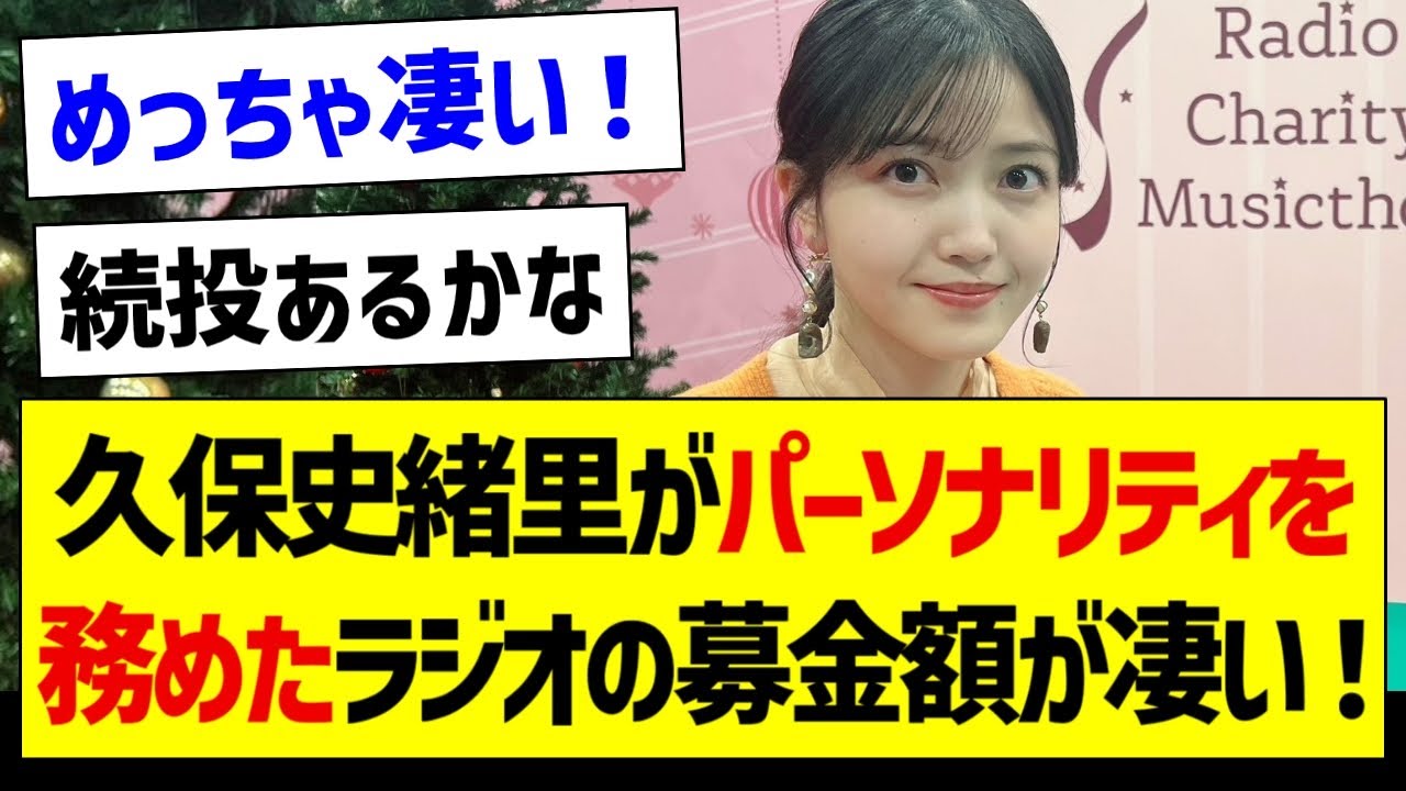 朗報久保しおりがパーソナリティを務めた ラジオの募金額が すごい第49回 ラジオチャリティミュージックソン皆様 から温かいお気持ちを寄せいただいた結果 最終募金総額は948 4117になりましたたくさんのご支援ご 協力本当にありがとうございまし た948 4万すごい じゃんおおすごい 額ミュージックソン大成功やん今年も グループである かめっちゃ言ったなこれは今年も続とある かラジオの勢いがなくなったとはいえまだ 1億円弱を集める能力はある か金額で比べるもんじゃないかもしれん けど2000年入ってから最高額じゃ ない息で見れる2008年以降で最高学だ な今年もパーソナリティ確定で はそんな多いん かチナストーンズ20218322万 22円20228641万31880 NHジニより多いならすごいこと乃木坂族 とさせるしかないえ1人でやってるのに 9000万はすごく ないあれ久保ちゃん1人でよくねって感じ だからな ミュージックソンの募金総額9400まか 改めて数字を聞くとすごすぎるよねマジで 感動だ わ金額は比べるもんでもないが保ちゃんの おかげでこういう活動があるって知ったお も多いと思う わ今年もパーソナリティ続としてもらい たいねとりあえずはスケジュール次第か なくちゃんすごすぎる来年も 期待もそうだけど目の不方の知識を知る 機会をたくさんくれたのも大きかったと 思う横浜リアで募金したのがもう 懐かしいくぼちゃんすごいなしっかり結果 出した ね日本放送社長な久保しおりに前かけして 成功だっ たろ俺がここから前明になったら怖くて外 には出れんは白場で出歩いてる人すげえ よ音の出る信号機ってセとか格好のきの やつ かくぼちゃん改めてお疲れ様や [音楽] ね
