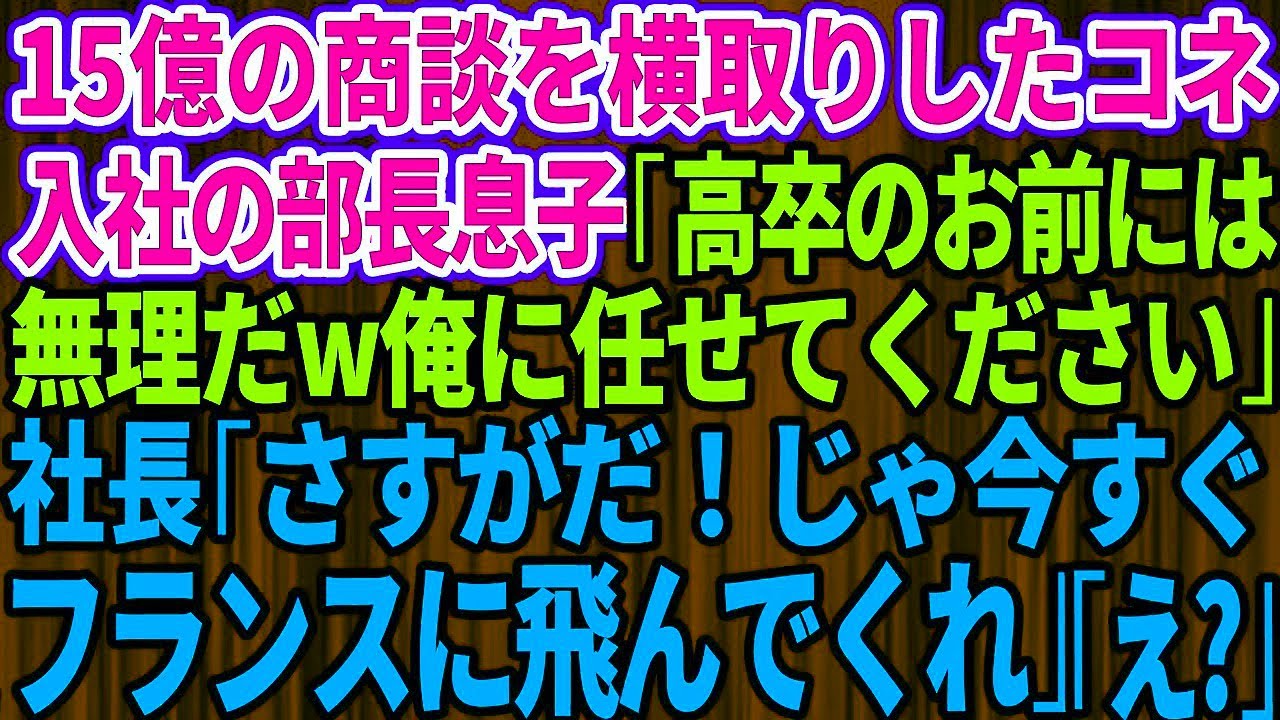 【スカッとする話】15億の商談をコネ入社の部長息子に横取りされた「高卒のお前には無理だw俺に商談を任せてください!」→社長「さすがだ!今すぐフランスに飛んでくれ」部長息子「え?」