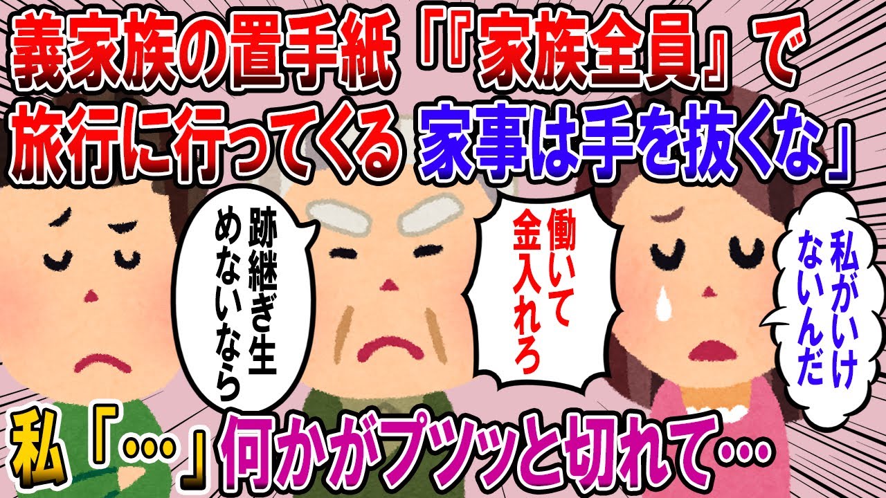 あらすじ:義家族の置手紙「『家族全員』で旅行に行ってくる。家事は手を抜くな」私「…」→この瞬間自分の中で何かがプツッと切れて…