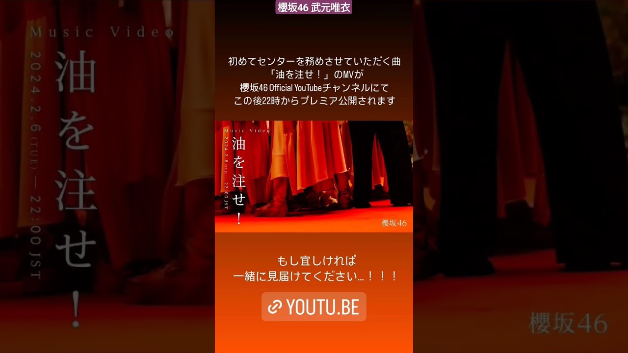 櫻坂46 武元唯衣「 油を注せ! 」MVが 本日2月6日22時公開、一緒にスタンバイしていただき是非盛り上げていただけると嬉しいですよろしくお願いします!