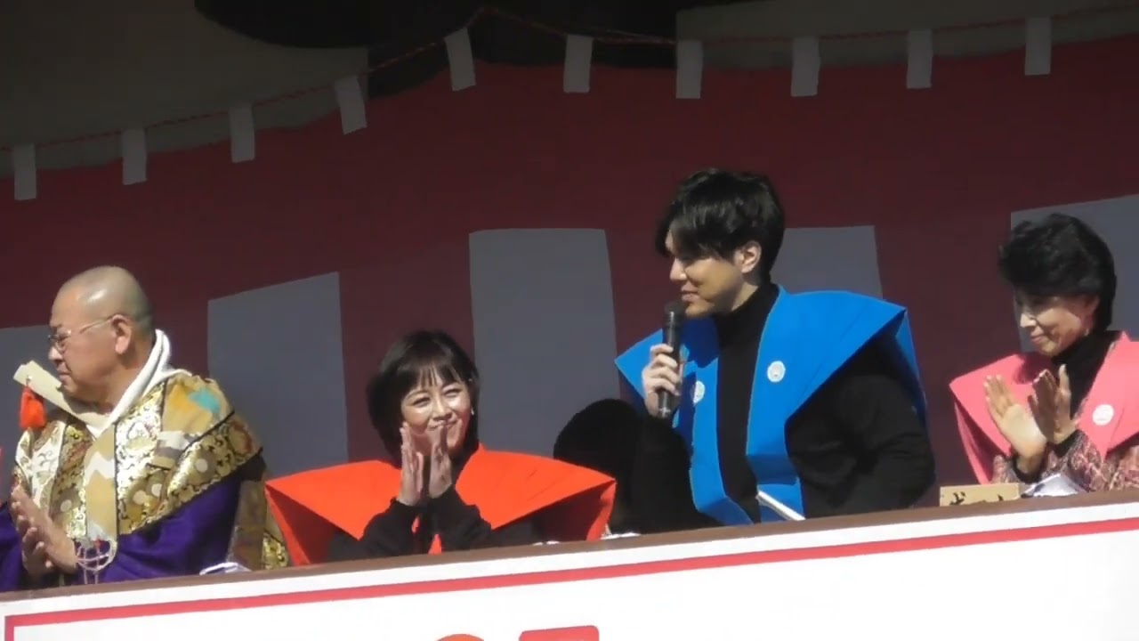 [音楽] あのありがとうございますえこういっを 皆の今年の平穏なを願いながら服を任せて いきたいと思いますのであの前の方には きっと届くと思うんですが後ろの皆様に なかなか届くかちょっと心配なんですが皆 さんで分け合いながら服を分け合いながら 是非え福豆を持って帰っていただきたいと 思いますよろしくお願いいたし ますありがとうござい ますさんお願いいたします皆さん こんにちは水サです こんにちはえ今日はですね皆様のおかげで 非常に晴れましたありがとうございますえ 皆様にしっかり服がえ今年来るように僕も 手一杯投げさせていただきたいなと思い ますえちょっと上からだとね非常に皆様の お顔が見えるんですけれどもあの小さなお 友達も今日来てますのでえ前の方にねえ ちょっと四角に小さなお友達がいるよて いうの頭の片隅に入れていただきますとえ 怪我がないかなと思いますえ後ろの皆様は え岡林張りの方で僕が届けたいと思います ので後ろの方安心してねあの前の方に押さ ずにそこで待ってください僕は一生懸命 投げますのでえよろしくお願いしますえ 楽しんでいきましょうお願いし [音楽] [拍手] ます [音楽] [音楽] ちえ特別ゲストの3本締めで参ります よもう 1度ありがとうございまし た持ちの方