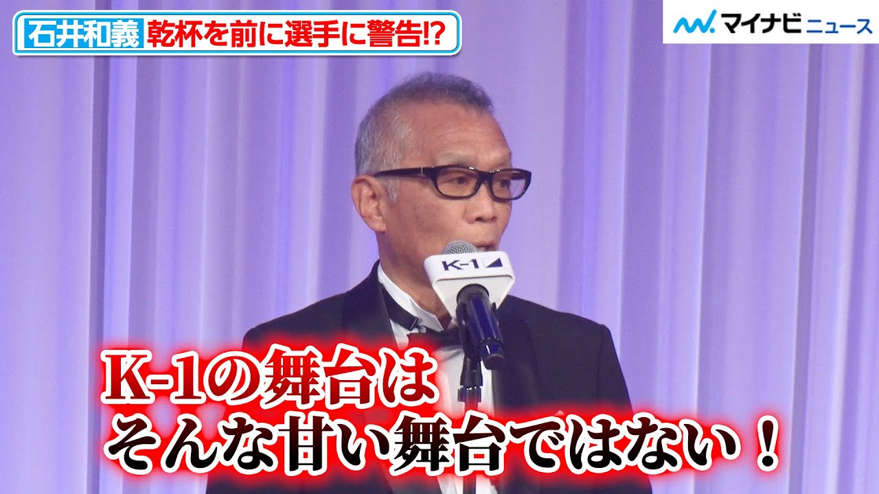慶王勝ちです世界には強い選手がいっぱい いるんだなということを改めてその時に 知らされました今回K1マックスが3月 20日にありますけどもグローリの選手と かワンの選手とか強い選手はいっぱいいる ように思われてますがそれ外に世界中では ですねいっぱい強い選手がいます僕 はワの選手を持ってきたりグロイの選手を 持ってきたりするよりもそういう世界中の 本当に強い選手を集めてそしてK1の舞台 こそが世界で1番強いんだそういう舞台を 皆さん方に作っていただきたい今まさに私 が考えておりましたいわゆるフェザー級と かライト級とか バンタムとかフライ日本人が1番強い階級 で今このK1が盛り上がってます最初k1 ヘビー級から始めた軽1がミドル級そして どんどん軽いクラスこの日本人の再撃戦区 あるいはアジアの再撃戦区人類の再撃戦区 のこのミドル級そしてライト級フェザー級 カクラスにどんどんどんどん広がって 世界中でこのK1 が開催されることを心から望んでおります えちょっと乾杯に入る前に一言 だけ最初集まった時アンディフグも ピーターアーツもアーネストホーストも 全員お酒飲んでまし た全員飲んでましたでもみんなやめたん ですなんでか分かり ますお酒飲んでたら勝てないん ですK1の舞台はそんな甘い舞台ではない だから選手の間は絶対お酒飲まないように ね気付けてくださいねはいお酒を飲んでる 選手は強くなれませんよそれ頭に置いてて くださいはいではグラスお願いし ます えまあの今日だけは許し ますではおすいません 大丈夫 ですではすいませんが立っていただきます かご紹介 くださいでは息とち生けるものが幸せで ありますようにそしてここにお集まり いただいた方がますます幸せになります ようにそしてこのK1がますます流静し ますように乾杯の温度を取らしていきます はい 杯以上ありがとうございまし た石井長どうもありがとうございまし [音楽] た