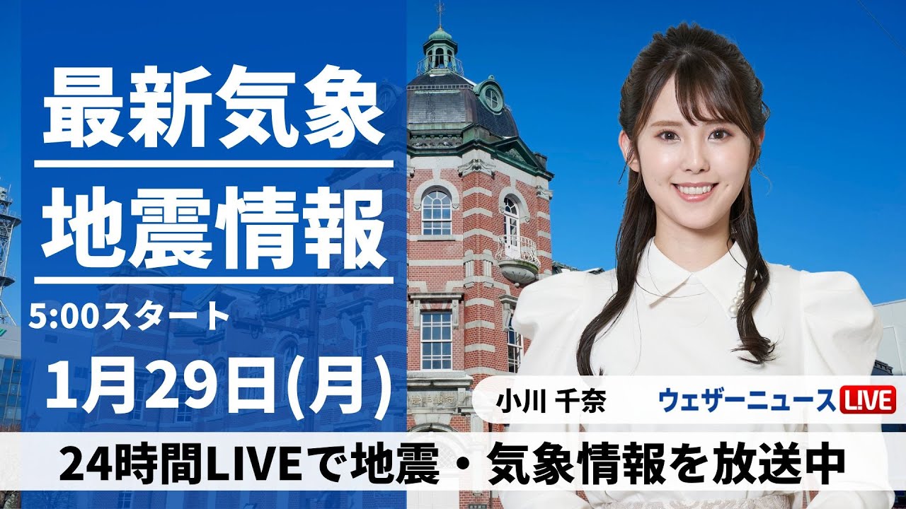【LIVE】最新気象・地震情報 2024年1月29日(月)/西日本、東日本は晴れる所多い〈ウェザーニュースLiVEモーニング〉