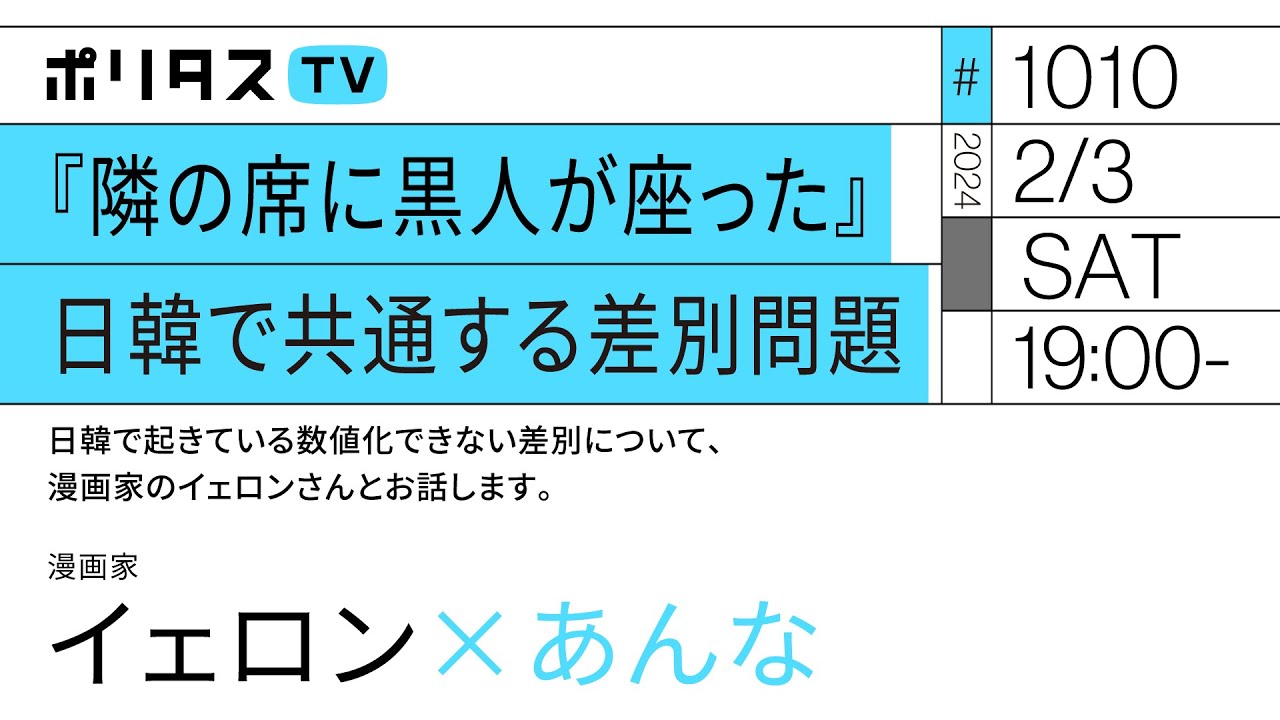 『隣の席に黒人が座った』日韓で共通する差別問題|日韓で起きている数値化できない差別について、漫画家のイェロンさんとお話します。|ゲスト:イェロン(2/3)#ポリタスTV