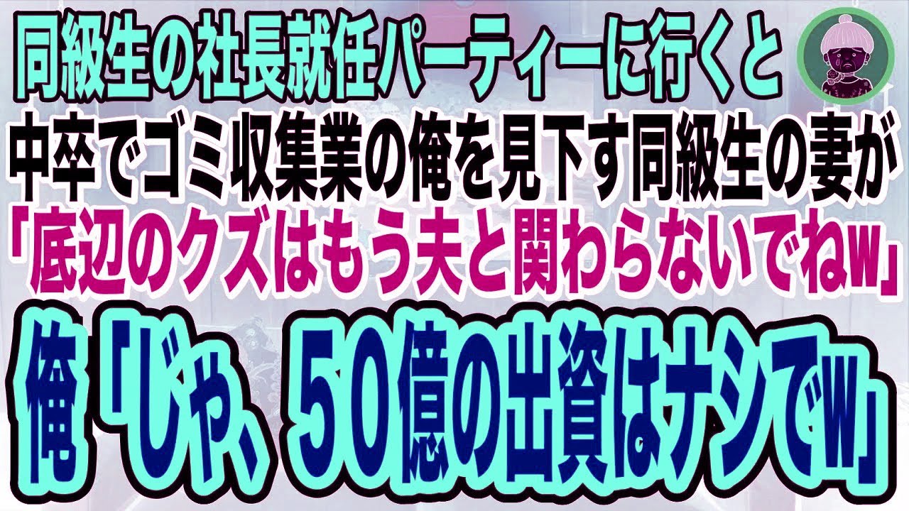 【スカッとする話】同級生の社長就任パーティに行くと、中卒でゴミ収集業の俺を見下す同級生の妻が「夫は大企業の社長になったのw底辺のクズとは縁を切らせて頂くわw」俺「じゃ、50億の出資はナシね」【総集編】