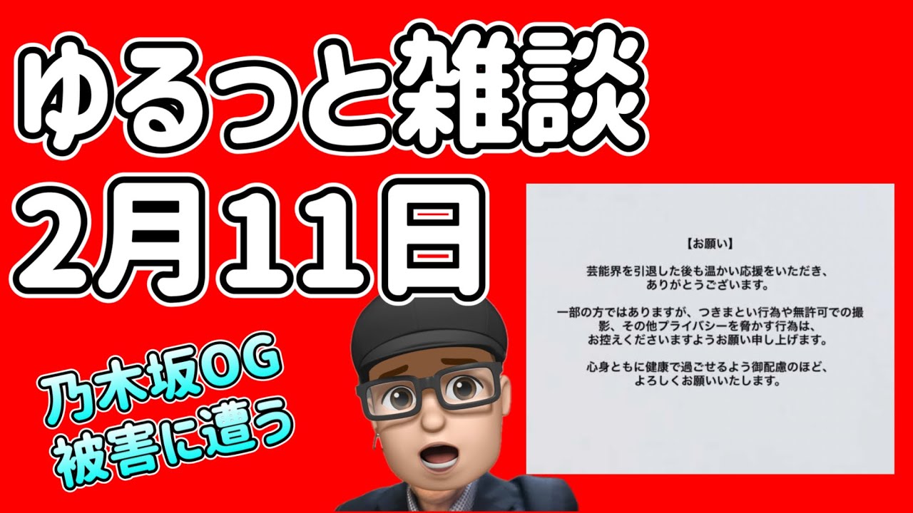 あま地方に住んでるんでねなかなか 見かけることはあライブ見にくとかね イベント行かない限りないんです がま過去にうんどこやったかなあの ちょっと忘れましたけど 横浜で電車に乗ってた時にね え農場あみさんを見かけたことはあの ございますはい王城さん3グラスかけて ましたけどねあのあのなんとなく分かり ましたはい まそれぐらいでしょうか ああとあるか な海坂メンバーではなかったと思う他の 芸能人の方ではねうん時々あるんですけど ね迷惑行為やめていただいたらななんて 思い ますあと昨日赤鉛筆 乃木坂 出演されたんですよね楽しそうでねえ ちょっと配信見てないんです がうんまああいうのもいいなっていう風に ねちょっと思いましたねうんみんなね赤い 帽子かぶって写真撮ってましたしね うんあれ選抜メンバーが出てるんですよね うんそういったところもいいんじゃないか なと思いますまあ今ねメンバー [音楽] ああうんの話聞いてるとねラジオとか聞い てるとバスラのリハをしてるということで もういカス切ってますので うん色々準備されてるんじゃないかな なんて思い ますま近いうちねえでD2のうん出せたら 今日出せなかったら明日 あ瀬取りのね予想を出したいななと思って おりますもう撮影終わってるんですけどね え瀬取り予想の編集が結構ねあの大変でし てすいませんお時間かかっており ますあと35枚目シングルがもしリリース されたらということのお話なんですが今日 11なので今日予告あっても来週来週予告 あっても再来週ということで選抜よあの 発表がね うんもしもし [音楽] い今日なくてねえ来週18日 選抜発表の予告があった場合うん2月25 日なので2月25日であれば あ12時からねえ皆さんと一緒に生配信さ せていただきたいなと思っておりますあと いうのはねえ2月25日 そうなんですあの埼玉にいますのでね え生配信ま簡単な生配信がなりますけどね えさせていただきたいななんて思っており ますまあ本当にねえまどうなることやらと