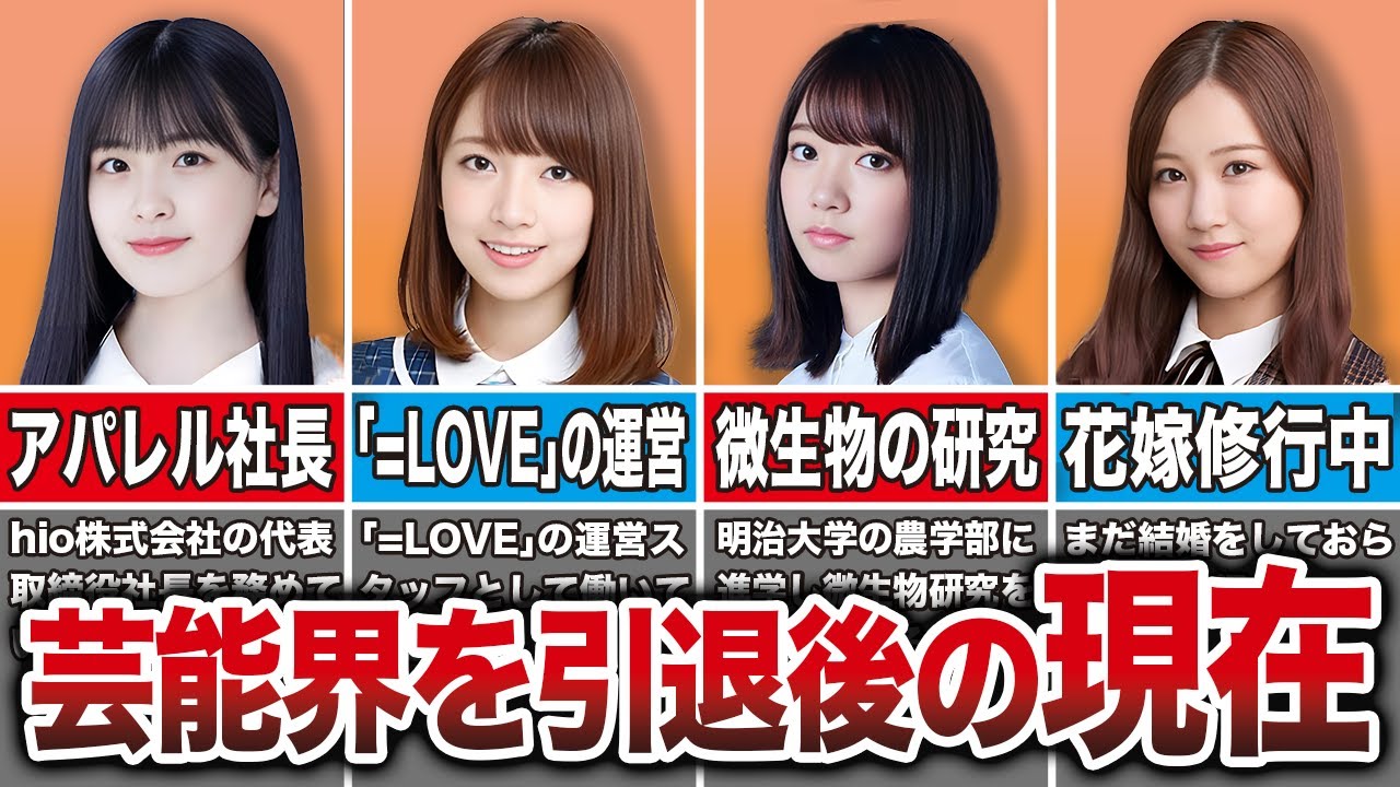 坂道グループには絶大な人気がありながら も芸能界を引退したメンバーがいます卒業 後は女優やモデルとして活動していくこと を期待されていた中であっさりと引退した メンバーや卒業後に会社を作って経営者と して成功しているメンバーもいます中には 長年の夢を叶えてサッカデビューした メンバーもいるため驚きです今回は芸能界 を引退した坂道メンバー7人の2024年 最新の姿を紹介しますまた坂道グループが 好きな方は是非チャンネル登録をよろしく お願いし ます 大園 ももこ大園さんは2021年9月に グループ卒業ととに芸能会を引退し現在 アパレルブランドフィルムを運営する費用 株式会社の代表取締り役社長を務めながら YouTubeでも活動を続けています 特に大園さんが運営するYouTube チャンネル背のびな暮らしは登録者数 39.2万人となっており現在も登録者数 が伸び続けています動画の内容は朝ご飯を 作る様子ややASMRなどごく普通の飾ら ない女の子の日常生活をまとめているよう な内容で大園さん本来の素朴で可愛らしい ところが活かされたチャンネルになってい ました大園さんはやれることを考えた時 どこの事務所にも所属したくなかったと 思い詰めるほど卒業と引退について悩んだ そうですが今の活躍ぶりを考えると人生に おける大切なターニングポイントだったの かもしれません乃木坂46在籍時は良くも 悪くもアイドルとしてグループのうちの 1人として見られる機会が多かったわけ ですがフリーになって自分のやりたい生き 方を貫く様子は見ていてとても楽しそうに 感じますこれからも大園さんらしく等身台 で愛される配信者経営者として輝いていっ てほしいです ね橋本 七美橋本さんは2017年に人気絶頂の中 芸能界を引退しましたが2024年現在 ソニーのアイドルイコールラブの運営 スタッフとして働いているのではないかと いう噂が出ています噂の理由としてはりで 行われたジャパンエキスポという採点に 橋本さんがおり運営スタッフとして働いて いたところを目撃したファンがSNSに 書き込んだことでしたしかしそのツイート はすぐにソニーから消して欲しいと要請が ありSNSに書き込んだファンはその要請 があったことを書き込んだ上でツイートを 消しています写真が掲載されていたわけで はないため真実かどうか確かめる方法が