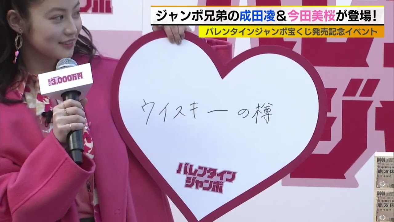 バレンタインジャンボ宝くじの発売記念 イベントが行われ成田涼さんと今田美さん が登場しました今回の賞金である3億円が 当たったら欲しいものを聞くと今田さんの 答えがウイスキーの樽です樽いいね私あの ハイボールが大好きなんですけどわかる はいあのちょっと自分のウイスキーの 樽ですごいね自分なりのちょっとわかん ないんですけどしかもも育っちゃうねそう そうなんですよ素晴らしいちょっと育てて みたいおお自分だけの樽いやすごいわそれ