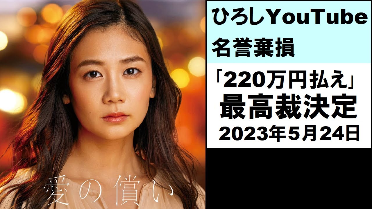 ひろしはYouTubeで人が死ぬ事件が 教団内でいっぱい発生している教団が タレントを監視していて外部と自由に連絡 が取れない教団で100万円以上もする 祈願がある自分の映画以外は海外の映画祭 の賞を受賞していないという4つの嘘を 発信し た東京高裁は2022年9月29日に対し 福の価格に110万円2017年にひを 介入したニュースタープロダクション 株式会社に44万円宣言よし子が所属する ariプロダクション株式会社に66万円 合計2020万円支払うよう命じる判決を 下し た地裁判決後ひしは動画の削除を命じられ たとしても同じ内容の動画を作成して公開 すれば良いと述べた交際はひのその発言に 対し名誉を毀損したことについて反省して おらずその態度は悪質であると指摘し た最高生は2023年5月24日ひしの 上告及び上告樹理申し立てを知りとける 決定を下したそれにより2022年9月 29日の交際判決が確定し た [音楽] [音楽] し