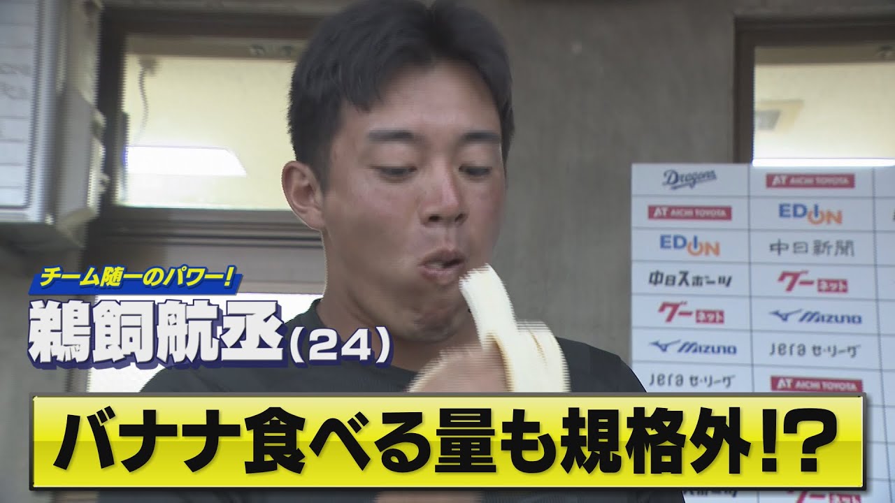 中京TV スポーツパワーはチーム随一豪快な作を 連発するのは名古屋出身の介選手2 歳その企画外のパワーには新加の中田選手 もすごいと大 絶賛そん のの グルトこの日は練習後に報道陣の謝罪を 受けていた迂回選手その横にいる球団 スタッフに預けていたのがバナナバナナの 皮も持ってるえ取材が終わると真っ先 にうまいっ す何本目ですか 6個目ぐらい多いじゃない すさらに外が真っ暗になるまで バッティング練習をしていたこの 日4本ぐらい ですもはや何食べたかわからないほの バナナ パワー着を狙いますやぱ開幕スタメンって いうのが1番の目標なんではい開幕戦にめ でられるようにあ頑張ってそして勝利収め たい ですいや1日に6本ちょっと量に驚い ちゃうんですけどスポーツする方にバナナ はおすすめなんですかめちゃめちゃ食べて ましたよねねいやでもバナナは糖質が高い だけじゃなくって伝とか食物繊維がすごく 含まからその長時間エネルギーを持続さ せるにはすごくいいあの食べ物なんですね だからアスリートの方とかこう野球選手の キャンプ中とかいうのはもうすごいいい あの食材ってことにはこれは間違いないん ですよそうただやっぱ1本90kgぐらい あるんでじゃあれたくさん食べちゃうと やっぱいっぱい一般の方はどうしても カロリーオーバーになってしまいますから 食べすぎやっぱ注意しなきゃいけなくって 僕らはやっぱ1日1本ぐらいにちゃんと セーブしとかないと ははあるなりねあじゃあカロリー以外で 言うと6本食べても平気な仕ああれだけ トレーニングしてありますからねその分は ちゃんとあのなんか燃焼させて るっていうことを考えるとすごいパワーの 源になってると思いますじゃあもうこれ からもモもり食べていただいて開幕め期待 し ましょう