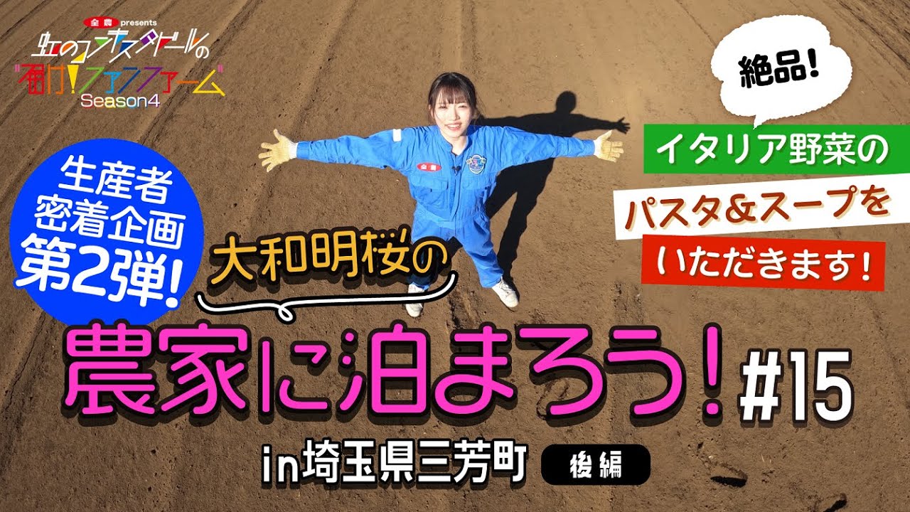 収穫だけだったらすっごい楽しいんです けど確かにカだって昨日こうやって取って たのにもう歩くのも遅くなっ て安部さん24時間ありがとうございまし たこちらこそありがとうございました こんな風邪強いないやもうめっちゃ 楽しかったですいや良かったですあのいい とこも悪いとこも見れたはいかなっていう 風に思ってますのではいありがとうござい ますどうですか私の仕事ぶりはあのもう いつもにないこのワクワク感っていうえ 仕事でてすごい楽しかったですも本当に 楽しかった良かったですもう最初から最後 までずっとさ楽しくてなんかちょっと今 寂しいなっていうあ嬉しいです感じなん ですけどいつでも来てくださいいやあ行き ますあのお互い頑張ってはい私もお野菜 いっぱい食べて感心してイタリア野菜も めっちゃみんなにしてほしいのでお願いし ますこれからも応援しますはい僕もあの ライブとか行かせてもらえばと思うのであ ぜひニコン大好きにはいもうファンになっ てますあ本当ですかはいありがとうござい ますじゃあ青押しで青しで行かせて いただきますお願いしますはいありがとう ございましありがとうございまし た農家に泊まろう企画第2弾終了しまし た率直に感想を言うとめちゃくちゃ 楽しかったです本当に24時間着させて いただいてちょっと最初はもう寒くてどう どうどうなるだろうって思ったんですけど 楽しい収穫の取り方とか競争とかさせて いただいてなんか本当に安部さんが全部 この農業をめちゃくちゃ楽しんでやってた なっていうのが印象的でいっぱい笑った なっていうことが多かったですねあとは なんかそのカメラ回ってないところでも 直売所にいた時に安部さんが先輩と後輩が いるんですっていうのを教えていただいて ですごいややいってやってて農家の皆さん の繋がりも見れてすごいなんかめっちゃ皆 さんにもこの農家の農家に泊まろう企画 やって欲しいっていうぐらいこの企画を 通して農業やりたいなって思ったぐらい 絶対本当にこの企画皆さんやった方 がいいぐらい本当に楽しい1日でしたこう いう楽しんでやってたりあと最後の片付き も大変だったけどなんか家族でやってるの を見てかっこいいなって改めて思いました しなんかより全脳の職の応援団としてのか さんを応援したいなっていう気持ちにも なりましたそしてイタリア野菜もね いっぱい皆さんにしてほしいのでこれから も頑張って応援していこうと思いますそれ ではファンファ4回もお楽しみにサボ
