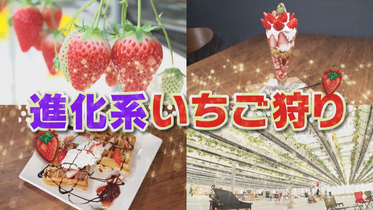 今日はこちらの方に来ていただきました どうぞは こんにちは浜坂準レギュラーの菅田あり です準レギュラーですよねはいあの年一 単位ぐらいで呼んでいただいてます ありがとうございます今日はですね最近の 進化系イチゴ狩りをご紹介しますへえ結構 びっくりするような驚きのイチゴ狩りが 楽しめるので動き変ですよね本当ですか すいません 行きましょう ガリすいません気をつけます行きましょう 行き ましょう弾頭の影響で例年よりスクスク 成長しまさに今が旬のイゴ今回は進化系 イチゴ狩りを大 調査顔より大きいです顔より大きいですね イチゴもりもりですねでございますえ や間違ってる 絶品いちごスイーツが衝撃価格新オープン のカフェが話題のいちご狩り にさっぱりしたさなんかいくらでも食べ られちゃうような感じ多分絶対1回食べた 方がいいうんと思う滅多にお目にかかれ ない激レア新品種が食べ放題のイチゴ狩り さらにこれめちゃくちゃ熟してません本当 ですねお宝けさお おあなたは知ってましたイチゴ狩りでしか 味わえない絶品イチゴの見分け方まずは 進化系のイチゴ狩こちらです空飛ぶイチゴ でポカポカえ空飛ぶイチゴはイチゴが空を 飛んでいる飛ぶか飛ばないですね飛ばない ですね空飛ぶイチゴでポカポカ全く関連性 のないワードだから意味わかんないですよ そうですねやってきたのは去年岐阜県に オープンした兵場空飛ぶイゴの正体 がじゃーんじゃーんわあえ広高すごい本当 に空飛んでますよ当だ見上げる形で ちょっともうお花見ならぬいみというかへ すごいご覧くださいイチゴの苗が天井から ぶら下がっている様まさに空飛ぶイゴです よね岐阜ではここだけで全国的にもかなり 珍しいそうなんですよこちら移動できるん ですあの高さを調節初めましてよろしくお 願いします私あのこういうものです矢沢 いちごと申します矢沢いちごさんはい いちごさんえお名前がですかあはいあの こちらのニックネームではいやってます びくしお名前をイチゴにしちゃうぐらい イチゴが大好きとそうですねもう クレイジーですイチゴクレイジーいい足元 がすごく歩きやすくて確かにフラットなの でお子さんとかもねそうですねはいベビー カーとか車椅子でもスイスイ入れてお子様 は走り回れて遊べるっていう感じになり
