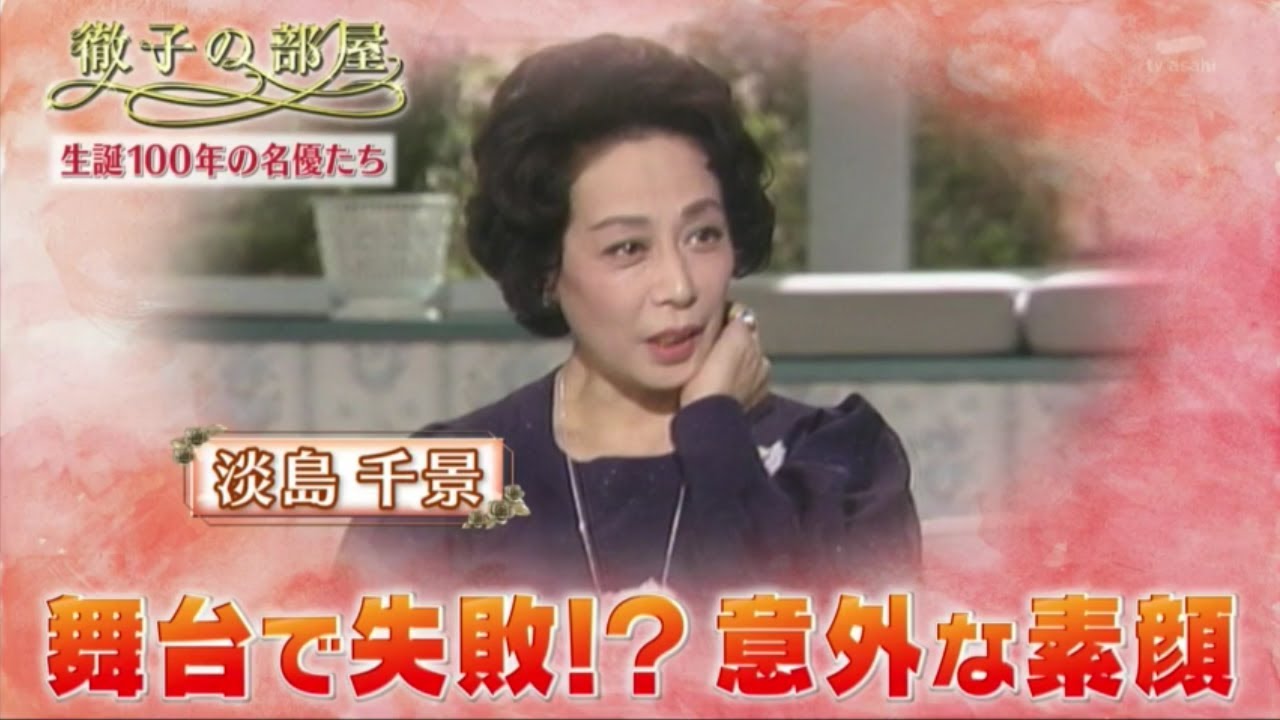 [音楽] 本日は今年生誕100年を迎える明友たち の傑作戦をお送り申し上げます淡島さんは 舞台での失敗など意外な素顔を鶴田浩司 さんは離れて暮らした母への思いを信子 さんは新藤彼と監督との結婚生活を赤木晴 さんは家庭での姑ぶりをどうぞお楽しみ ください 今日のお客様は宝塚の娘役スターから映画 スターにおりになった方でいらっしゃい ます淡島ちかさんまよくいらしてください まし今日はまた素敵なニットの洋服ひね ニットが好きなんですあそうですかいつも お着物あのお召らっしゃるからと思ったら そうなんです私はね洋服着るとねあの人が じろじろ見てね私なんか忘れもしたのかと 思 あの島さんですかいうかはて言ったらお 洋服も気になるんですかてまるで来ちゃ いけないもの着てるような顔してねあの 言われたりすることがあるんですよだから 皆さん着物と思ってらっしゃるらしいん ですね今今やええ随分こうやって伺伺って てお話伺いながら拝見してたら随分こう あれであのグランマーてらっしゃるのね びっくりしたそうなんですよだからね時の こと2度びっくりって言った人がいいん ですよ顔見たらねも小さい顔だとしたの そんなに自分ではねちっちゃい顔と思わ なかったのでも小顔で随分ちっちゃい顔だ なって言ってびっくりしたっていうので そのつに下見てくと言いたくはないんです けどねあんまりグラマなんでまたびっくり ってこうしちゃる方が本当にだか2度 びっくり本当に私なんか3度ぐらい驚いた もいやひどいだってお洋服お召にな るっていうんでまだまず驚いてそれから あの拝見してこんなね大変なグラマー でらっしゃるんでびっっくりしやだもう さてそのお引っ越しのとても多く てらっしゃる方どのくらいとても引っ越し いや私ちゃんと正確に数えたことはないん ですけれど もそうですねあのちっちゃい時からのこと 考えました20回は越してるんじゃないん ですかしらねじゃこういう社会にお入りに なってからほもうたくさん越しましたで しかも東京都内だけじゃないんですね随分 遠いところの方まであ鎌倉とか熱海ええそ 滋賀県の方なんかにもいらしあれはね やっぱり争中で会ですからそですごは あまりいませんがでもあの初会って言って も東京にもううちがございませんでした からやっぱりそこを住みかにいたしました からやっぱりそこも住んだってことになる