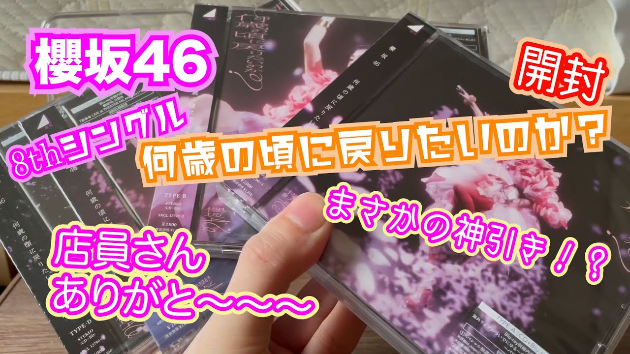 はい今日はね何をやっていくかと言います とじゃーんということではいということで ですね2月の21日に桜坂46の新曲です ねいくつの頃に戻りたいかが発売されまし たということで ねタイプAからDまでを1枚ずつ購入して きましたので本日はねこちら開封して中に 生写真がね1枚入っておりますのでそちら をね見ていこうかなと思いますということ なんですけどちょっとね開封する前に1つ ねあのお話しておきたいことがあって多分 何かの動画でえっと話してたかと思うん ですけどあの今回ちょっとあのねこの桜坂 46のねあのオンラインミーグリの期間が ですねちょっと私のねま仕事の休みとま うまいことはまらないのもあって今回あの オンラインミグを残念ながらあの1枚も 申し込んでいない状態だったんですよでま リアルミーグリには絶対参加したいのでま リアはおそらくね発表されてなかったん ですけど喋ってた時はなんですけどま おそらく4月か5月だろうと思ってなんで まリアルミーグリにはたくさん参今回は今 まで以上に購入してたくさん参加します なんて言ってたんですけどなんとねリアル ミグの日程が発表されたらあの今回は私が ねいつも参加するのは基本関東の会場に なるのでえっと幕張メッセの会場になるの かな今回もね発表されたんですけどなんと その日付が4月7日4月7日ですね言い なす必要ないんだけど4月の7日日曜日に ねやるということだったんですけど ちょっとね残念なお知らせがあって4月の 7日なんと私人生初の日向坂46のね ライブ当選してましてもろかぶりというね もうなんか本当今回のねこのシングルに 関してマジでなんだろうとことん予定が 合わないなっていう感じなんですけどもう あのねちょっとどうしようかなと思ったん ですけどでもやっぱ行きたいなと思ったの とまライブがねまどっちにしろ夕方からま 夕方とか夜から始まるのでまい時間帯だっ たら行けるんじゃないかなと思ったので ちょっと前回お話してたよにちょっと積む たくさんね今回買うのはちょっと諦めたと いうかやめたんですけどまあ今まで通りと か前回と同じ枚数でね4枚購入してきたの でまあ1部と2部にちょっとね今回リアル ミグに関してはあの申し込みをまとめてね でま当たってくれたら参加しに行って 終わり次第ねあのライブに向かうっていう ドタバタ劇になりそうなんですけど ちょっと今回はねだからそういったことも あってあの本当はねもっと積もうと思った んですけどね今回ちょっとすいません諦め