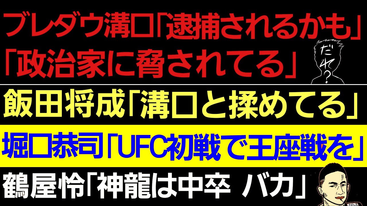 〇ブレイキングダウン溝口「政治家に脅されてる」「捕まるかも」/飯田将成「溝口と言い合いになった」〇堀口恭司「UFC初戦で王者と戦いたい」〇鶴屋怜 神龍誠との確執「中卒 バカ」〇武尊戦 過去最高収益