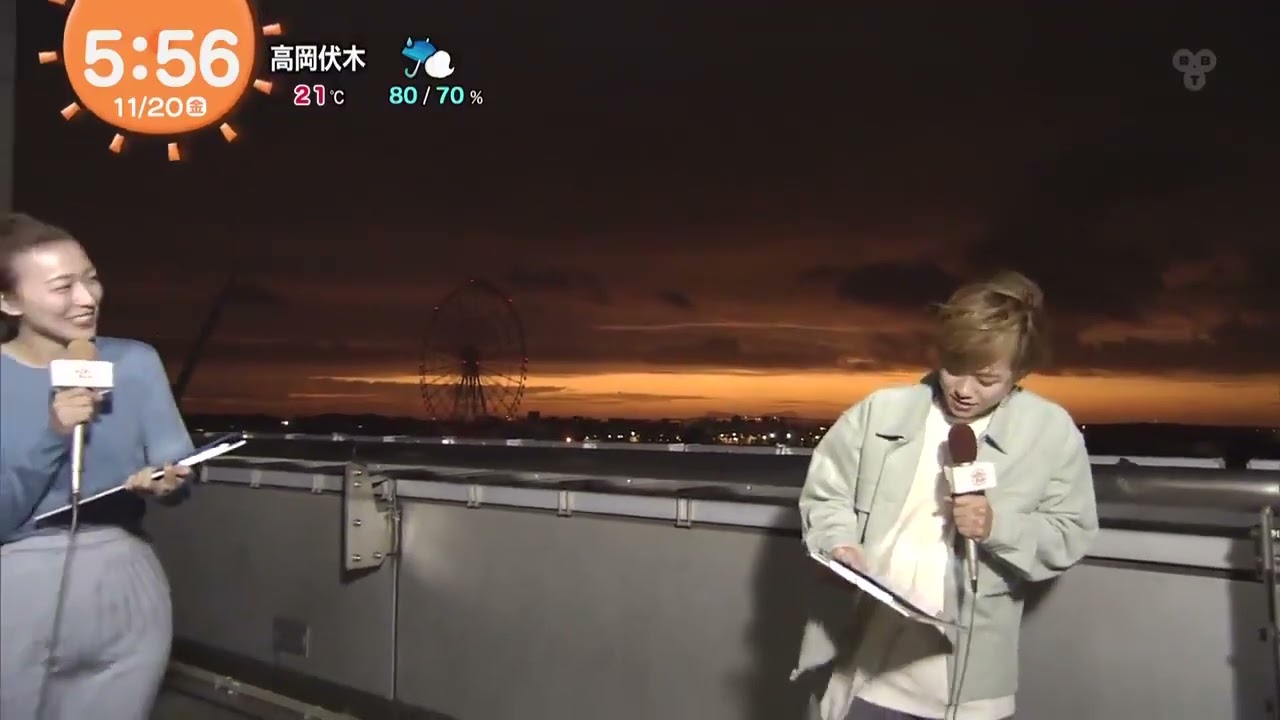 全国のお天気をお伝えしますさあ今日は何 男子の皆さんが目覚ましテレビゲストに来 てくれていますがここお天気にはこの方 リーダーの大橋君が来てくれていますはい 大橋かですよろしくお願いしますはい元気 の挨拶ありがとうございますよろしくお 願いしますそうだいちょっとね風が とっても強いですねタブはないですか 大丈夫ですかそうですね風は生のと詰めた のちょっと間ぐらいですねそうですねはい では実際ラドなのかこちらです現在の気温 22°もあるんですねちょっと高いですね ちょっと高いねはいびっくりするような 気温ですがこの22度は9月中旬並み11 月としては記録的に温かい朝なんですね はい全国的にも温かい朝となっているよう ですでは今日はお天気雨も気になります 全国のお天気を見ていきましょう