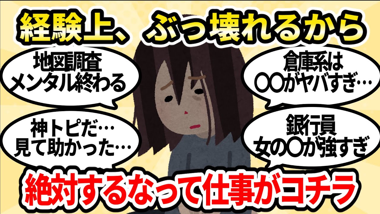 生のバイトだけでいたりするからトラブル あっても高校生のバイトが対処する自転車 で家まで謝りに行かされたりつばは枯れ たりした専門分野で経験不問で求人出し てるところ鵜呑みにして経験どころか知識 ゼで入ると地獄を見る小学校の先生マジで やめな人生捨てるようなもん営業ジム営業 の人って外でペコペコしている分ジムに 八つ当たりするそしてそうそういう扱いに なるたお骨が今度は自分がやる番と新人 いじめ負けのループだから営業営業事務に 関わっちゃいけない郵便局郵便貯金保険 全て覚えなければいけない覚えること多 すぎる某夢の国客層悪い社員が変社内恋愛 多すぎて気を使う結婚式上時間に追われ てるのと失敗が許されない部分もあるのか 皆性格も言葉もきついきついお客様の前で は笑顔だけど扉1つ隔てたら別世界勝手に 魔法の扉名付けてたいろんな部門に分れ てるから意見が合わないとバトの荒らしで 繁忙機は物が飛ぶとか日常差半時そのく 業界自体が社用なのもあって給料は低いし 休み希望を出そうものならバ声が飛ぶ めでたい席の裏は壮絶だった先細りはほぼ 確定なのでお勧めしない教員30から40 年くらい前なら良い職業だったかもしれ ないが今の時代は精神やむ 福士辛いのに安い正保の人たちの面倒を見 てるのにそいつらより苦しい暮らし優しく なんて出来やしないいかがでしたか自分を 壊してからでは遅いですご視聴ありがとう ございました