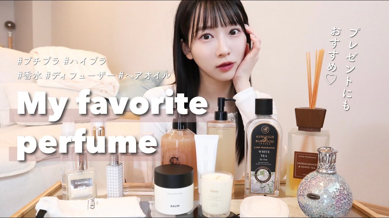 皆さんこんにちはおちいのです今日はです ねじゃんこんな感じで久しぶりに香りもの 紹介をしていきたいと思います香水だっ たりヘアオイルとかルームフレグランス まで私のお気に入りをたくさん紹介するの で是非参考にしていただけたら嬉しいです ちなみにプチプラのものからハイブランド のもので結構ギフトとかにもおすめなので 参考にしてみてくださいそれでは早速 スタート です声が暖房で枯れちゃってるんですけど すみませんよろしくお願いしますまずは 香水とヘアオイル類から紹介していきたい と思います最近私が使っている香水はここ ら辺なんですけど香水ってさ私結構人と かぶりたくない派なのでめっちゃ流行っ てる香水はあんまりつけないんですけどて いうのもなんか私の匂いとして覚えて 欲しいのであった時に買いでも別別に私の 前にいっぱい香ってたら私の匂いになら ないから定着する香りがいいなと思って あんまり被らないようにしてるので そもそもあんまり香水紹介をしないし表で も言わないんですけど今日は特別に教えて あげます前もねちらっと紹介した気がする んですがバーバリーハーオードパルファム ってやつですなんかこれね新しく出て2 種類あるのかな確かだけど私はこっちの薄 ピンクの方を使っていますこれ結構甘め 甘めの香りですお菓子のような甘さだけど そんなにくどくない感じで私基本的に甘い 系と石鹸系と爽やか系が好きなんですけど バニラとかココナツとかの重たい甘さが 苦手なので軽やかな甘さが好きな方にはお 勧めですなんか私韓国に旅行に行った時に 1回空港でおじさんに声をかけられて Twitterでね確か呟いたんだけど 片言の日本語でお姉さんの匂いがすっごい いい匂いだから香水を教えてくださいって 言われたの僕の妻にその香水をプレゼント したいから教えてくれって言われてこう やってあの教えた経験があるっていう くらいいい匂いの香水ですちょっと甘めだ からもしかしたら好き嫌いは別れるかも しれないけど基本的になんか気にいられる ことが私は多いかなまでもね成とかは自分 が好きなのが一番大事だと思ってるので私 は自分が一番気分が上がるものをけるのが 好きですそして続きましてじゃん トムフォードのソレイユネージュ シマリングボディオイルスキンオイルって やつですこれはね香水じゃないのかなもし かしたらわかんないんだけどとにかくこの キラキラしてるビジュアルが可愛くて 伝わるめっちゃキラキラなのボディオイル