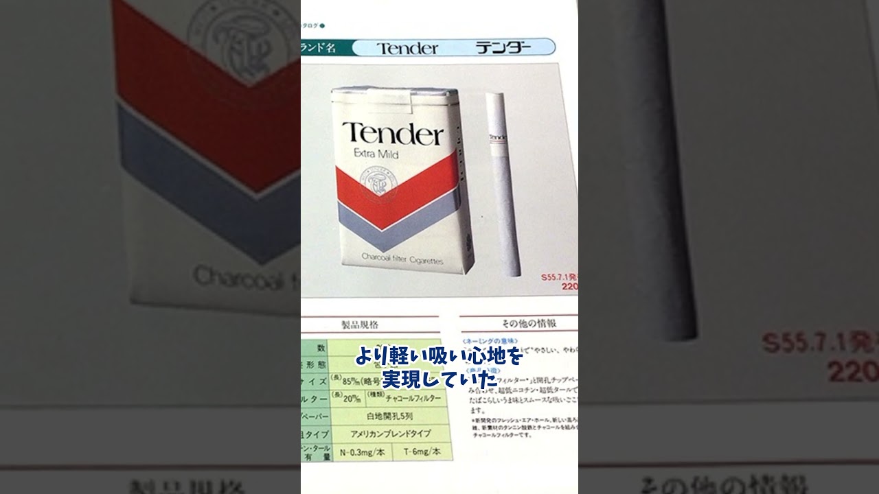 テナーというタバコをご存じだろうか 1980年に発売されたタバコでその名前 が示す通り優しさや柔らかさをコンセプト にした製品だったこのタバコは特に喫煙 初心者や軽いタバコを好む人々に向けて 設計され1mmの薄さを持つフィルターが 特徴だったこのフィルターの設計により 吸い込む煙の量を自然と調節しより軽い 吸い心地を実現していたそのためテンダー は初めてのタバコとして多くの人々に選ば れ喫煙の世界への入門としての役割を 果たしたテンダーの市場における ポジションは当時としては確信的であった 多くのタバコが強さや濃厚な味わいを全面 に出していた中でテンダーは軽さや優しさ を売りに出しそれまでのタバコ市場には なかった新しいニーズを捉えたこの戦略は 特には海世代や女性喫煙者からの指示を 集めテンダーはまた琢間に人気製品となっ たのだ