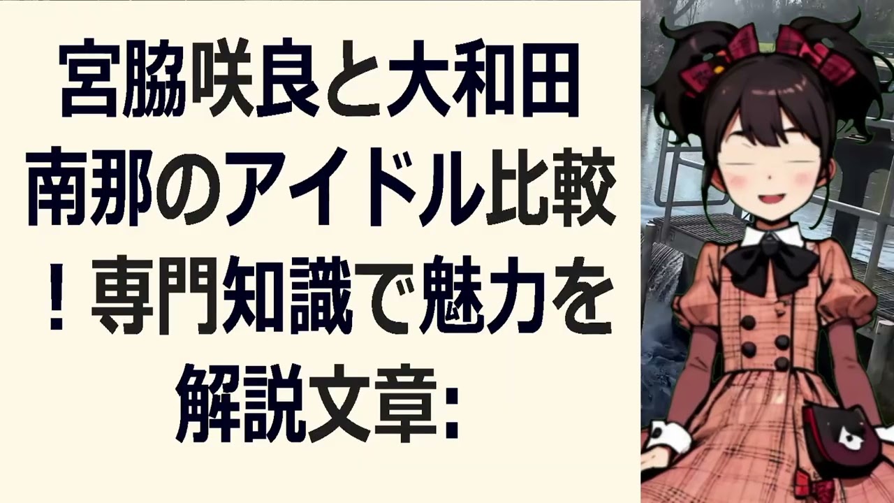 と大だ7のアイドル比較専門知識で魅力を 解説 ちゃこんにちは皆さん今回は宮脇ささんと 大田7さんのアイドル活動を比較してみ たいと思います専門知識を駆使して彼女 たちの魅力を解説していきますまず宮脇桜 についてご紹介します彼女はAKB48の 元メンバーでグローバルな活躍をしてい ます宮脇ささんの魅力はその美しい ルックスと豊富な経験から来る パフォーマンス力にあります彼女の過小力 やダンススキルは多くのファンを魅了して います一方大和田7さんは乃木坂46の メンバとして活躍しています彼女の魅は その愛苦しい笑顔と柔らかい雰囲気にあり ます 大和7さんの持つ魅力は彼女の パフォーマンスの中にある独自の母星です 彼女の過力や強面力は多くの人々の心を 打ちますこの2人のアイドルを比較すると 宮脇桜さんはよりパワフルな パフォーマンスを披露しています一方 大和田7さんは独自の個性を持ちしさが ありますどちらの魅力もそれぞれのファに とっては欠かせないものですこの動画では 宮脇ささんと大和田7さんの魅力をより 深くさるっていきますどちらのアイドルが 好みかまた両方を応援している方には必見 の内容です是非動画内でのコメント欄から あなたの意見や感想を教えてください最後 にこの動画の情報提供の価値と解決策の 提案についてお話しします宮ささんと 大73の3の方々にとってこの動画は彼女 たちのアイドル活動に関する貴重な情報 提供しますさらに彼女たちの力について 深く掘りれどちらを応援するか迷っている 方々にとっては解決策の一助に なるでしょ是非この動画をご覧いただき 宮脇さんとダさんのアイドル活動について ドリフ隠しっていただけれ ば幸いですコメント欄ではあなたの意見や 感想をお待ちしています是非ご参加 ください動画をご覧いただきありがとう ございますこの動画が気に入っていただけ ましたら是非あなたのコメントもお待ちし ていますチャンネル登録もお願いし ます あ
