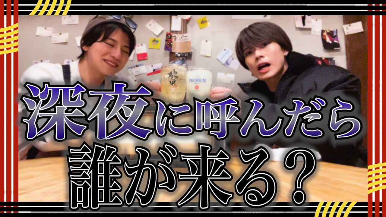 りたしたせーの パはいえっと2人でねちょっとご飯けるん ですけどはい今大阪遠征ではいみんな同じ ホテルに泊まってますそうですねま明日も 同じ予定でそうです同じ場所に止まってて はいちょっと僕たちの人望を確認したいな ということめ たいということではい全員メンバー 呼び出したいと思いますよしか3時46 分はい ボル全員メンバーをに電話して誰が来るの かというねはい企画をしていきたいと思い ますスここねあの新宿にもあるリロスって いうやつが大阪にもあって朝6時までやっ てるということでちゃんとアポ通りました ということでやっていきたいと思います せーの1で竜の [音楽] 末じゃあ 早速成田が嫌いな三平からま気合いです けど三平から開けていきたいと思います 一旦ね了解 じゃーんじゃあ三平にかけたいと思います はいお願いします よしもし ます今何してます かすかちょっと今藤田と焼肉してるんです けど焼肉はいちょっとぺくの大好きなん でないかなって いうもう朝の4時前だけどまあ ちょっと来てほしいなって いうはい待ってますねっていうことだけ 伝えときますお店と近あじゃあまあ近いん でジュースだけ送っときますね う何の迷いだそれは ピン今から今から2人2人っす待ってるね 当 [音楽] はいるねはい店送っときますうんうんうん はいはい はいはいえっとちょっとよくわかんなかっ た ねちょっとよくわからんかったんでえ次は お待たせいたしましたリオンリオン出るか なリオンはなんか寝てそうこの時間を来て たらすごいねリオン確リオンかけ [音楽] ます もしもし何してる寝てたうんいやなんか 寝ようとしてたあ結構更かしたんなんだね ちょに言うと率直に言うとさっまで俺あ そうなんだえ今からご飯食べ ない会いに来てほしいな う住所だけ送っとくねオやっぱ愛情あると 思うからリオはオああ所だけ送っとくね