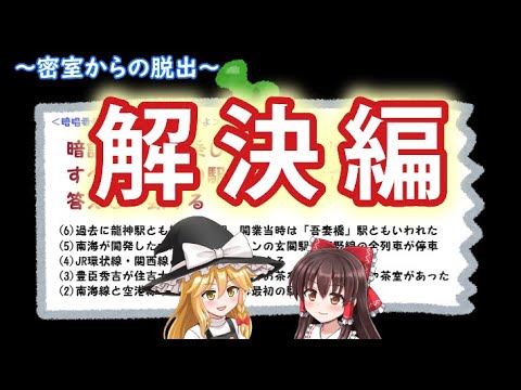 はい こんばんはあの別の動画で霊夢と魔理沙を 閉じ込めてしまったんで今日はその2人を 脱出させるための臨時の特別動画ですま 謎解きだったり数学的要素だったりそう いった点がすごい多いんでそういったのが 苦手な方はえ視聴ご遠慮くださいでは早速 始めましょうこの謎をといったら暗証番号 が分かってその暗証番号を入力してドアを 開けて脱出するという設定でですじゃは スタートしますすでにあの2人は2番から 6番が何役なのかをまずきにかかり出して ますよしそれじゃあ霊夢まあ6つという割 には確かに5つしかないけどとりあえず その5つを確認していくぜうんまずこの中 ですぐにパッと分かるのはどれだ2番と4 番だよ4番は新今宮駅番号は32番は泉さ の駅で本線と空港線が分岐するからその次 の駅ってことで本線は羽崎空港線はリンク タウンになるけどリンクタウンには車庫は ないからこれは神崎だよいいぞ霊夢その 調子だぜじゃああとは356だな上から見 ていこうかそうだなじゃあまず6番だこれ が思いつかないやまあ任せとけれ 友人とはかつて堺駅と港駅の間にあった駅 だぜこの友人の他にさらに大幅駅なんての もかつてはあって明治大正年間のうちの ほの一時旅客と貨物の両方の輸送に貢献し た駅だぜへえそれが戦後の空襲被害からの 復興の際にすぐ近くにあった堺駅と統合し たんだなるほど あと改良当時の酒駅の駅名であ東橋という 名前もこうして駅前の交差店名として残っ ているぜじゃあ6番は酒駅だねそうだなん じゃ次は5番だそもそも南海沿線でニュー タウンといえばこれらが思い浮かんでくる がこのうち開発者は誰かを確認すると こんな風になるここから南海本線沿線と 千木線沿線のものを覗くと狭山ニュー タウンか林間田園都市のどちらかになるで も狭山ニュータウンの玄関駅も林間田園 都市もどちらも荒野線の全列車が止まるよ そうだなだからここは狭山ニュータウン よりも林田の方がより一層大規模な面積に 渡り開発していることと金剛駅は南海とは 関係ない会社が作ったニュータウンへの 最寄り駅としても混ざっていることから 一応5番の答えは林間田園都市駅として おくぜ分かった それじゃああとは3番だこれは簡単だぜ 霊夢え豊秀吉といえば織田信長の後を継い で天下を集中に収め天下を統一したいわば 天下人だその天下人が茶屋で一服入れた天 か茶屋ああなるほど点が茶やかそういう ことだぜそういや確かにが茶屋駅と隣の岸