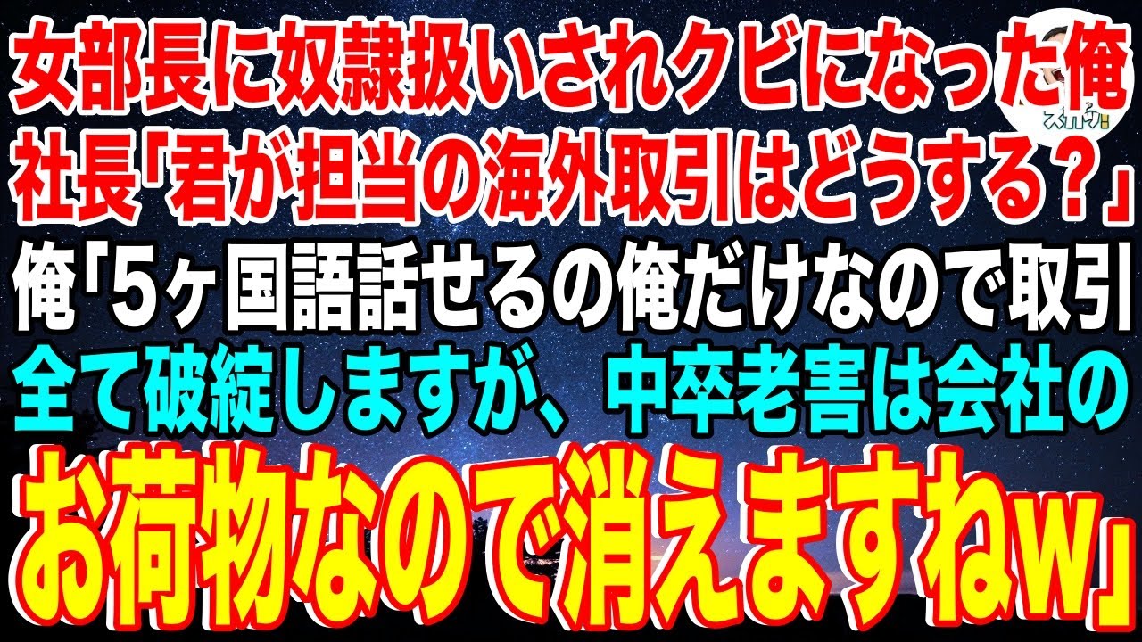【スカッと】女部長に奴隷扱いされクビになった俺に社長「君が唯一の窓口だった海外取引はどうなる?」俺「5ヶ国語話せるの俺だけなので取引は破綻ですが、中卒の老害のお荷物は消えますw」社長「は?」【総集編】