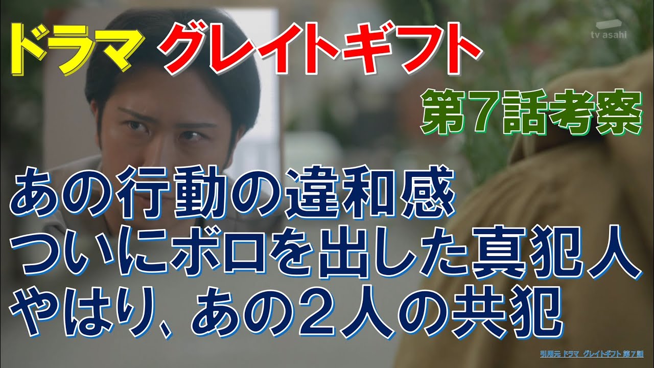 考察とは物事を明らかにするためによく 考え調べることであるこんにちはDセル フィッシュですこのチャンネルはドラマや 漫画についての考察をロジカルかつ独走的 な観点で行いプレゼン形式で紹介していく チャンネルです今回はドラマグレート ギフトあの行動の違和感ついにボロを出し た新犯人やはりあの2人の共犯と題して 木曜21時からテレビ朝日系列で放送され ているドラマグレートギフトの第7話で気 になった点について考察してみたいと思い ます最初はクルメは単なる1研究員につい てです第7話のラストでクルメが国立生命 履行学研究所の職員であることが明らかに なりました どうやらオクトセブンを作ったのもクメの ようですねただ誤解してはいけないのは クルメは研究の中でオクトセブンを 生み出しただけであって新犯人というわけ ではありません仮にそうだとしても今まで 隠し続けてきた理由はどこにあるの でしょう考えられそうな理由はいくつか あり ますまず単純にここで名乗りでれば自分が 犯人だと思言われるからですあるいは研究 者としてオクトセブンの研究を続けたかっ たということもあるかもしれませんどちら も理由としてはありそうな感じがします ねそしてもう1つクメの心に刻まれている のは安田が殺害された理由を突き止めると いう使命ですそういう意味では安田を殺害 する理由がないクメが新犯人ということは まずありえません クメがサイコパス的な人物でない限り殺害 後に安田の店に足し通うということはない でしょうしね現状クルメが新犯人ではない という絶対的な決め手はありませんがその 可能性は高いように思い ます次に安田と板橋の共通校についてです 殺害された安田と板橋についてですが共に 末の患者だったということが明らかになり ましたやはりそうした理由で2人を利用し たのでしょうかその可能性もありますが 都合がいいから利用したというよりも本人 たちの意思を尊重したように感じます週末 期の患者ともなれば当然費用や労力の面で 家族に負担をかけることになりますから ね2人はそうした思いを病院内でトロして いたのかももしれませんつまりそのことを 知った新犯人が慈悲的な意味も込めて計画 に利用させてもらったということですね 以前の考察でヤベでのクルメたちと安田の 家族の会話が妙に明るい感じだったのが気 になったと言いましたこれは介護から解放 された家族のアド感を表していたのでは