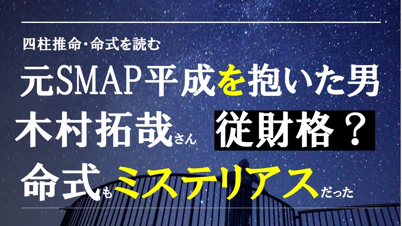 [音楽] 今日は元SMAPのメンバー平成を抱いた 男木村拓也さんの明式と運勢を読んでいき たいと思います今は解散してしまった SMAPですが元メンバーの方々の名識を 出して運勢を読み込んでいくとある傾向が 目につきますあれほど人気のあった スマップですが運勢が良かったのは草強し さんだけで他のメンバーは今の方が運勢が いい方とこれから運勢が良くなる方が多い ということですこの運勢の流れをどう 読み込むかは難しいところですがどこかで まとめてみたいと思います本題の木村拓也 さんに話を戻そうと思います中水明を勉強 している人なら木村拓也さんの名識を見る とある疑いを持つ人が多いと思いますそれ はもしかしたら重罪格ではないだろうかと いう疑問です 政治不明なので明確な答えを出すことは 難しいですが少し考察してみたいと思い ます奥様の工藤静さんもとても特徴がある 名識をしているので一緒に載せておきます 木村拓也さん 1972年11月13日生まれ政治は不明 です明式は念の柱から水のいのね月中が かのとのいが土の絵の猿となります8歳 立運で大雲はかのとのいい水の絵のね水の の牛木江の虎木のう火江の立日の美と巡っ ていきます続いて奥様の工藤静さんですが 1970年4月14日生まれ政治は不明 です明式は念の柱からかの犬月中がかのへ の立日中が木野へのうとなります大雲は7 歳立運でかのへの達から土ののう土の絵の 虎日のの牛火のの根木ののい木江の犬と 巡っていく運勢になっていますご夫婦の 暗証ご夫婦の暗証もとても特徴が出ている と思います木村拓さんは藤さんから見て 自分が欲しい星をたくさん持っている方 ですが木村拓也さんから工藤静さんを見る と重大格の時の用人はたくさん持ってい ますただ普通名識の時の用人は3中で見る 限りどこにも見当たりません本来ならこの ことを持って普通明式と重罪格の考察を 打ち切っても良いのですが工藤静さんの 明式がきであり運監視に土のが巡っていた ことに加えて男性を引きつける要素満載な 明式であることがお話を簡単に片付けられ なくしています工藤静さんの名識について は詳しく見ていきませんが27歳までが 絶頂運だったと思います少し誤差はあり ますが結婚後の活動を考えれば運勢に沿っ た生き方を選ばれていなと感じます従格の 可能性いつもは人物像から入るのですが 重罪格と普通名識の未多と言われる名識な のか今日は先に理論的なお話をしていき