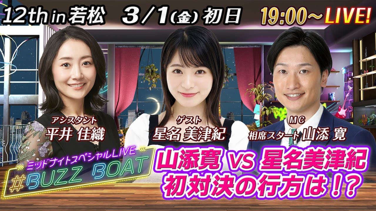 【MCは山添寛!ゲストに星名美津紀が登場!】ミッドナイトボートレース!ミッドナイトスペシャルLIVE #BUZZ BOAT 3月1日(金)19:00~|ボートレース若松 初日|