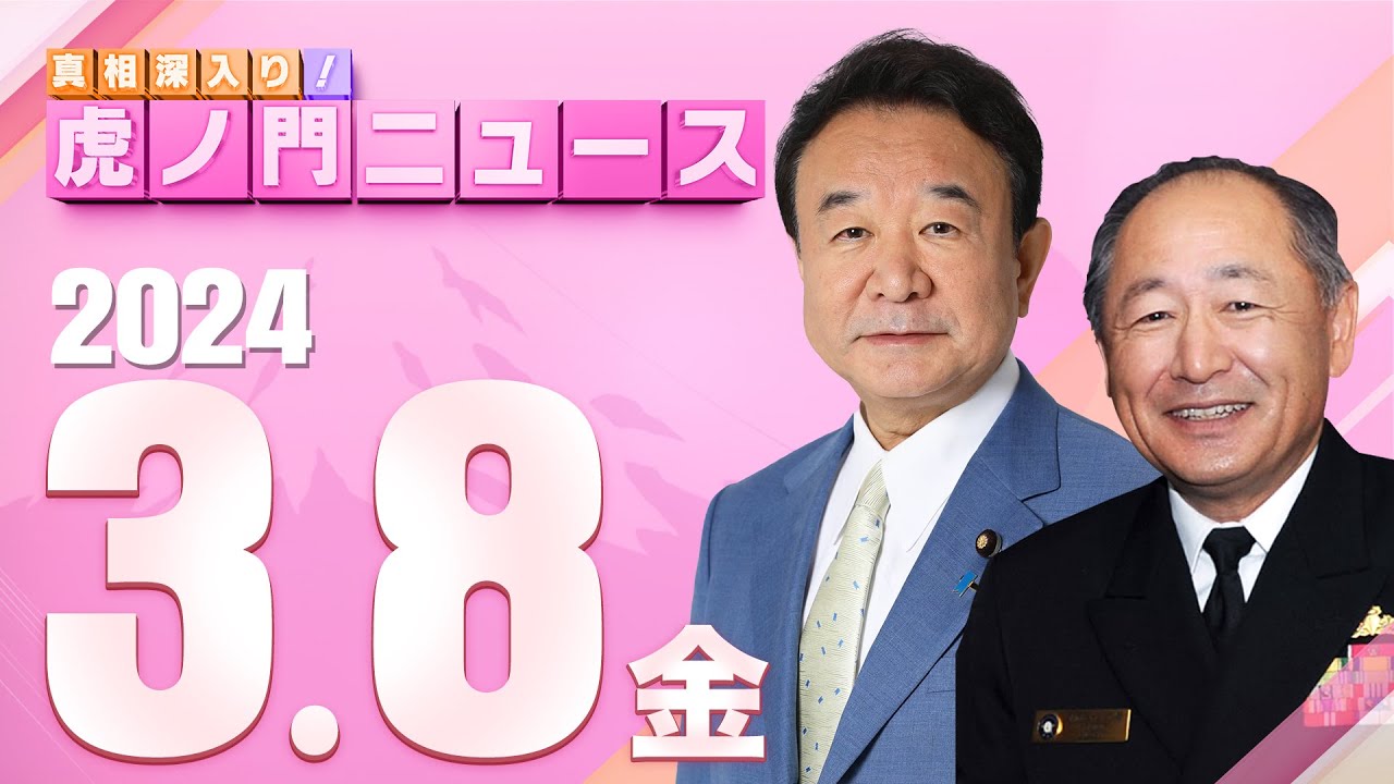 [音楽] [音楽] [音楽] DET DET [音楽] [音楽] [音楽] DET H [音楽] JA おはようございます3月8日金曜日虎ノ門 ニュースです今週もよろしくお願いいたし ますさあえ東京はトノ先ほどまで行が落ち ていました今日は最高気温が10°最低 気温が1°ということで午前中はまだ雪が 降る可能性があるということで午後は雨に 変わります傘を持ってお出かけください そして日本の領土の天気予報もお伝えして おきます尖閣諸島は曇りで最高気温が 177°そして竹島が晴れで最高気温7° 北方領土は曇りで標天下3度という天気 予報になっています是非日本の領土の天気 予報を皆さん知っておいてくださいさあえ ゲストの2人が今スタジオへと向かってき てくださっています今日はですね青山茂原 さんとそして河野勝敏さんが登場をして くださいますえ青山さんのファンの皆さん 女性の方を中心にですね雨が少し落ちる中 ですがこちらスタジオに向かってきて くださっています今日は青山さんは本会議 国会本会議中ということでこの後はすぐに ですね5回と向かわれます握手しながら今 登場されていますえさらにえ河野さんには 国防のことをたっぷりと伺っていきたいと 思いますえ特に今日はですね中国の動きを しっかりと皆さんにお伝えしていくことが できればという風に思いますさあえまも なくスタジオに青さんとさんが登場され ますどうもおはようございますおはよう ございますおはようございお忙しい中どう もありがとうございますどうぞこちらお 座りください青さん手前でカさん中央にお 座りいただければと思いますはいさっき まで雪降ってたんですけど上がりましたね あ上がりました良かったですどうぞお座り ください今日もよろしくお願いいたし ますさあえタイトルコールにまず行きたい と思いますが今朝の段階でですね登録者数 が93人を超えましてに入ってもう5万人 増 皆さんのおかげです本当にありがとう ございますもうさんのおですえパさんの おかげですさんのおさんおかげです