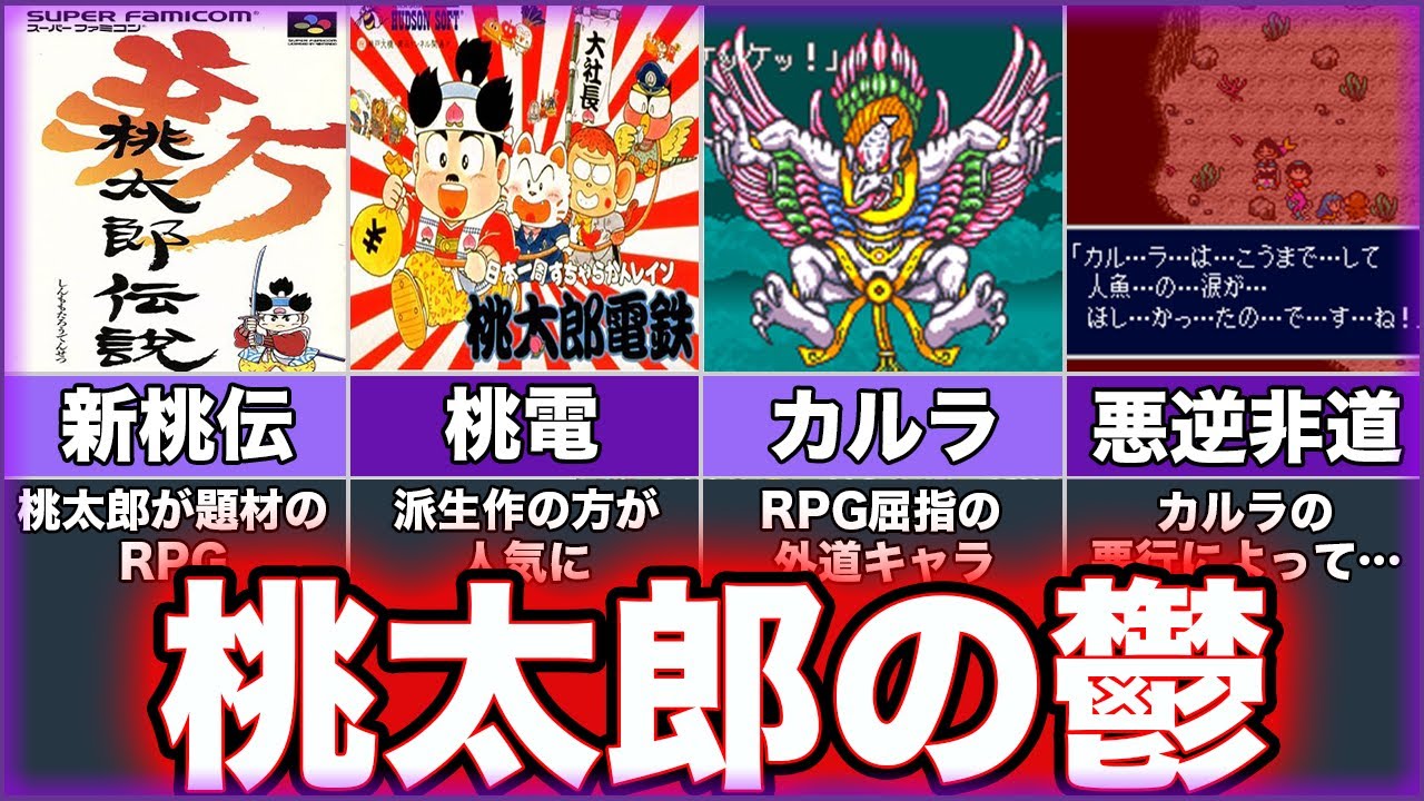 ゆっっくり魔理沙ですゆっくり霊夢です 今回は今はなきハドソンから1993年に 発売された新桃太郎伝説の話をしていくぜ このゲームはファミコン版の桃太郎伝説の 6年後の世界を舞台にした正当な続編と なっているんだこれってうつゲの話よね 桃太郎伝説って桃太郎伝説とかの 可愛らしい桃太郎たちが出てくる作品じゃ ないの正確に言うと桃太郎伝説シリーズの 外伝となるのが桃太郎伝説だな外伝の方が 有名になったパターンねそして霊夢の言う 通り桃太郎伝説は伝説と同じように 可愛らしいキャラクターが多数登場する 作品で独特なシステムやギャグ要素の多さ などでファミコン版も他のRPGとは一戦 を隠した内容だったんだますますこの チャンネルで紹介する意味が分からないわ そうなんだが新桃太郎伝説はこの チャンネルにふさわしい内容なんだぜどう してそうなるのか聞いてみたくなったわ 新桃太郎伝説のお話となんでうつなのか 教えてちょうだい霊夢も興味を持った ところで話していくが新桃太郎伝説は打つ 展開の連続なんだその原因になっているの は敵である鬼川のあるキャラクターなんだ ぜそのキャラクターがひどいことをするの かしらああカルラというキャラクターだぜ こいつの悪業が原因で新桃太郎伝説は打つ 展開で有名になったんだキャラクター1人 でそこまででは新桃太郎伝説のあすを話し ていくぜ前作の桃太郎伝説の続編なのよね ああ新桃太郎伝説では前作ラストで桃太郎 にこらしめられて開心したエマ様が奈落の 底に落とされるところから始まるぜじゃあ エンマ様がいいやつになっているのそうだ ぜそしてエマ様への処罰を終えた後鬼の 大野王に月の宮殿を襲提案をするのがカラ だ早速悪さをしようとしているのねカラは バサラ王の長男の代打王子を連れ月の宮殿 のかぐや姫を捉えに行くぜその知らせを 聞いた桃太郎が月の宮殿に向かうところ から新桃太郎伝説は始まるんだここまで 聞くと悪の鬼を桃太郎が倒しに行く昔 ながらの完全長悪の物語って感じねエマ様 が最初から回心してるのは別としてで 桃太郎はどうなるの前作での戦いを経験し てる桃太郎は最初からめちゃくちゃ強くて ゲーム内ではダで表記されるレベルも高く 魔法に当たる術も使え最強装備もつけて いるぜ続編作品にありがちな前作の経験は どうしたの矛盾がないのね珍しいよな そして桃太郎はなんなく月の宮殿の奥に たどり着くが代打応じにボコボコにされて しまうぜ術を奪われブグも弾き飛ばされ レベルも1に戻ってしまうんださらにキー