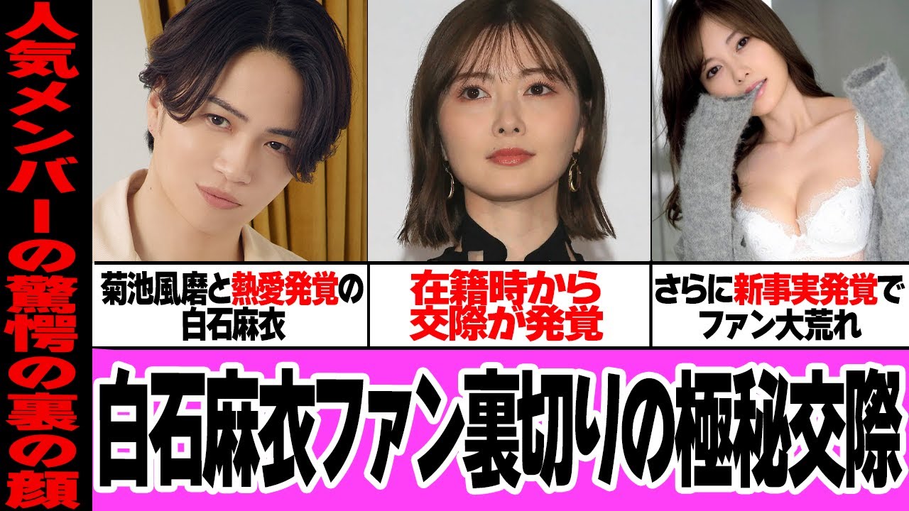 皆さんこんにちはセクシーゾーンの菊フマ さんと元乃木坂46で女優の白石舞さんの 熱愛報道が話題となっている現在両事務所 はこの2人の関係について否定しておらず 2人は現在結婚前提で交際中のようです しかしそんな2人は多忙により破していた 時期がありましたこの破間中 さんは別の女性と熱愛の噂匂わせの数々が 浮上さらに白石さんとの交際開始時期が 驚きでした今回は菊さんと白石さんがここ まで2人の関係を隠し通すことができた 理由についてや菊さんのやばすぎる元カノ との噂についてご紹介いたします是非最後 までご覧くださいアイドル界のトップを 走る菊フマさんと白石舞さん菊さんは グループでの活動だけでなく個人での活躍 も目覚ましく現在ドラマやバラエティに 引っ張りだこです一方乃木坂46の絶対的 エースだった白石さんは20年10月に グループを卒業約9年の活動で浮いた話も なくノースキャンダルで優秀の美を飾った ことがファンに賞賛されていました しかし実は4年ほど前に開催された白石 さんの卒業コンサート時にはすでに菊さん と交際していたようで当時の現役メンバー も何人かは2人の交際を把握していたよう ですということは2人の交際期間は4年 以上長く関係が表沙汰にならなかった背景 には秘密の関係を守るための2つの掟が 存在していたんだとか掟について白さんの 友人を名乗る人物が語りましたまず2人の 関係は原則公害禁止交際の事実を伝える 相手はかなり限定していたようです白石 さんが乃木坂にいた時期は今は絶対にバレ たらだめと長い間誰にも言わず胸にしまっ ていたそう親友だった乃木坂の某メンバー にすら当初は内緒にしていたそのメンバー が卒業する時にようやく打ち明けたとか 週刊誌に取られないファンに関係を知られ ないために徹底された関係を公害しない ことともう1つは2人で外出禁止という ものだったそうです2人が会うのは基本的 に互いの自宅でのみ菊さんが白石さんの 部屋を訪れることが多かったそうです白石 さんが帰宅した後必ず時間差をつけ別の マンション入り口から菊さんは部屋を訪ね ていた移動の際は地下駐車場を使い外に姿 をさらさないよう徹底していた2人は21 年から都心にそびえる高級タワー マンションの別々の部屋に住んでいたそう ですが同じマンションに1人ずつ出入り する姿は何度も確認されていましたがこの 徹底ぶりから2人で外出するなど交の決定 的瞬間をめことはなかったようですそして 22年の年明けに菊さんが同マンション
