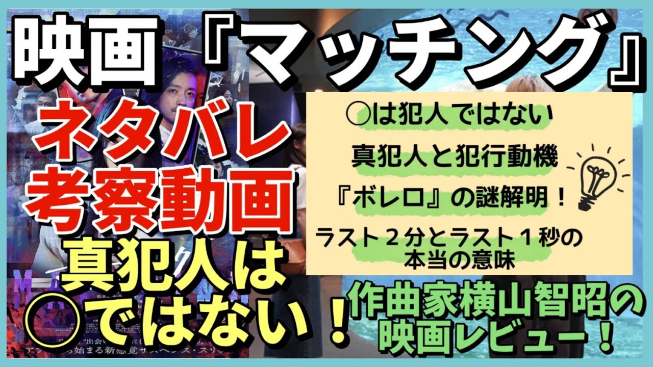 こんにちはこんばんは作曲家の横山友明 ですこの動画は映画マッチングのネタバレ をたくさん含むので必ず本編を見てから 動画をご視聴くださいまずいきなりですが ラストシーンから振り返ってみたいと思い ますラスト5分ぐらいのところでトムが 公衆トイレに入っていって血のついた ナイフを洗うシーンがありますその後場面 が切り替わってトムとリンカさんは水間に 一緒に行ってで最後手をついでトムが画面 に向かってつまりお客さんの方に向かって にゃっと洗ってエンディングでしたねま これだけ見るとトムが最後に起ったアプリ コン殺人をしたと普通に受け取ればそう なるんですけれどもちょっと疑問が浮かび ますそもそもトムは特殊清掃員の仕事を ずっとやってますつまり 孤独死した部屋とか殺人が起こった部屋だ とかそういうところ清掃して綺麗にする プロであるわけでなぜナイフだけをそこで 洗っていたのかトイレに向かうトムの姿は 特に服に血がついたりとか手に血がつい たりそういうことはなかったのでそこに 疑問が残りますえここでアプリコン連続 殺人の犯人の候補をあげていきたいと思い ますまずトムですねそれから蔭山 マッチングアプリの開発者ですあと蔭山の 部下アプリのやり取りとかを覗き見してた エンジニアですねあとリンカの父親の不倫 相手斉藤ゆきさんが演じてましたねその 辺りがまあできそうかなっていうところな んですけどもまず蔭山は後半に容疑者とし て警察に囚われましてで取り調べを受けて いると影山ま囚われているさ中にまた 新しいアプリコ殺人が発生したんでま除外 かなとただ蔭山は1軒のアプリコ殺人と リンカの同僚の殺人を自白しています蔭山 の部下ですけれども映画中のキャラとして あまりにまモブというかなので彼が犯人だ とあまり面白くないなというところがあっ て除外残るはトムということになるんです がそもそもアプリコ 連続人をやるために必要なことま結婚した 夫婦がアプリコしたという情報を知ること それから夫婦の個人情報ですね住所とか ですねを知ることが必須になりますえトは リンカさんの自宅を突き止めたというま 実績という方辺ですねはあるんですけども これは例えばリンカさんの高校のアルバム とかま実なのでいくらでも知りよがあるか なっていうのでアプリコしたことそして その夫婦の住所という情報まで全てトムが つめるかどうかそういう能力があるのか ハッキング能力とかそういう描写は全く なかったのでその辺はちょっと難しいん