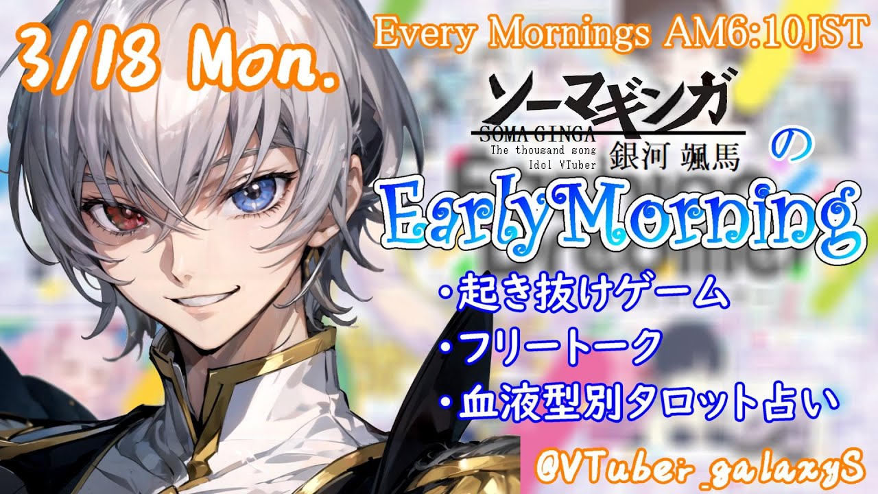 【#朝活 】3/18 銀河颯馬のEarlyMorning 起き抜けにゲームと占いと雑談✨【毎朝6時10分から#地下アイドルの #朝活配信/Vtuber/銀河颯馬】