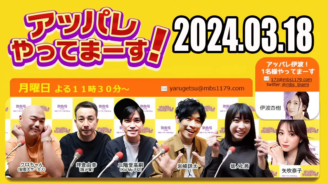 【2024.03.18】アッパレやってまーす!月曜日【クロちゃん(安田大サーカス)、坪倉由幸(我が家)、二階堂高嗣(Kis-My-Ft2)、岩崎諒太、坂ノ上茜、矢吹奈子】