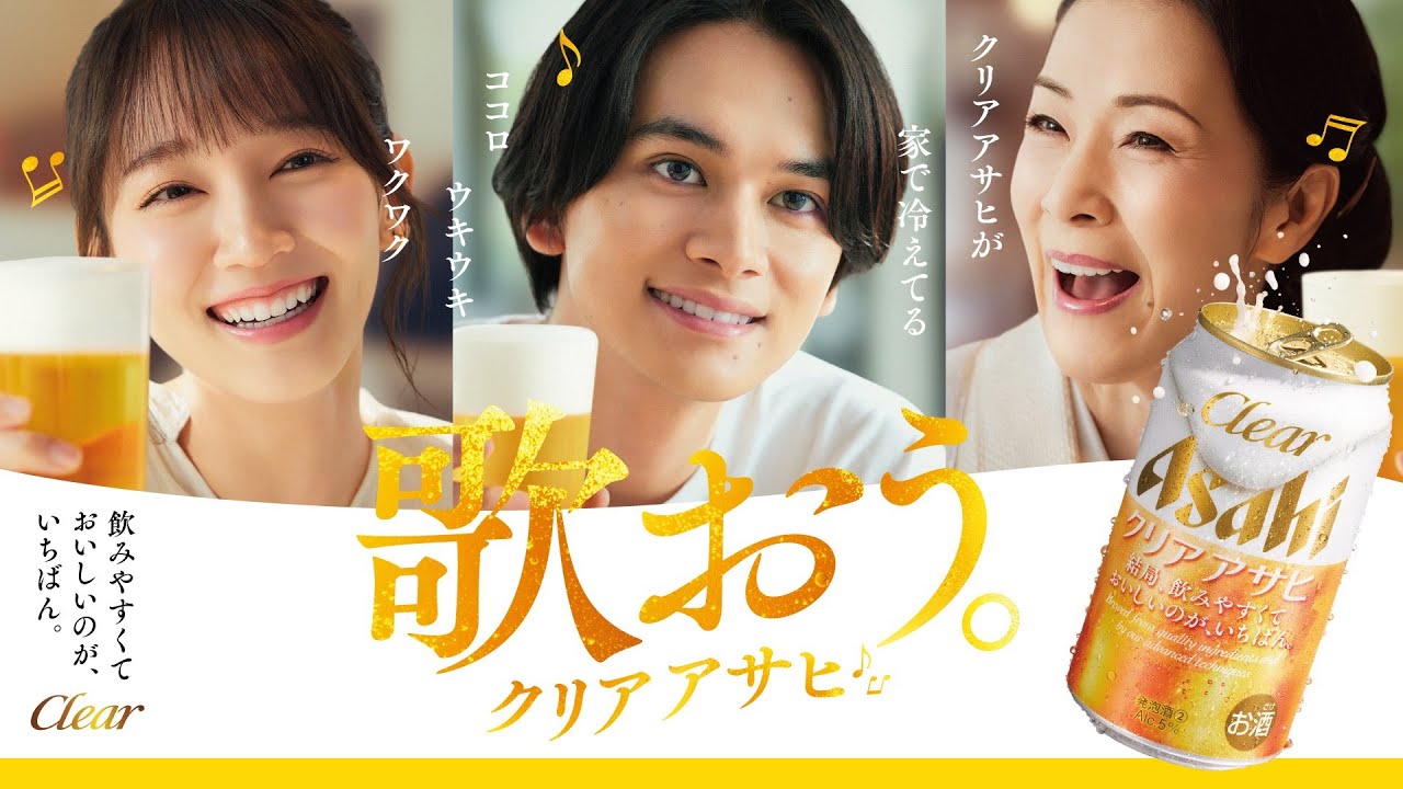 ブランドコミュニケーションの一新に伴い、新たに国⺠的演歌歌手の坂本冬美、幅広い世代から支持を集める俳優の吉岡里帆、俳優・アーティストで、今回がお酒のCM初出演となる北村匠海を起用した新CMを放映。「歌おう。」をキーメッセージに、「クリアブギウギ」を歌うシーンとともに、気持ち晴れやかな日常を過ごす3人それぞれの等身大の姿を描いている。