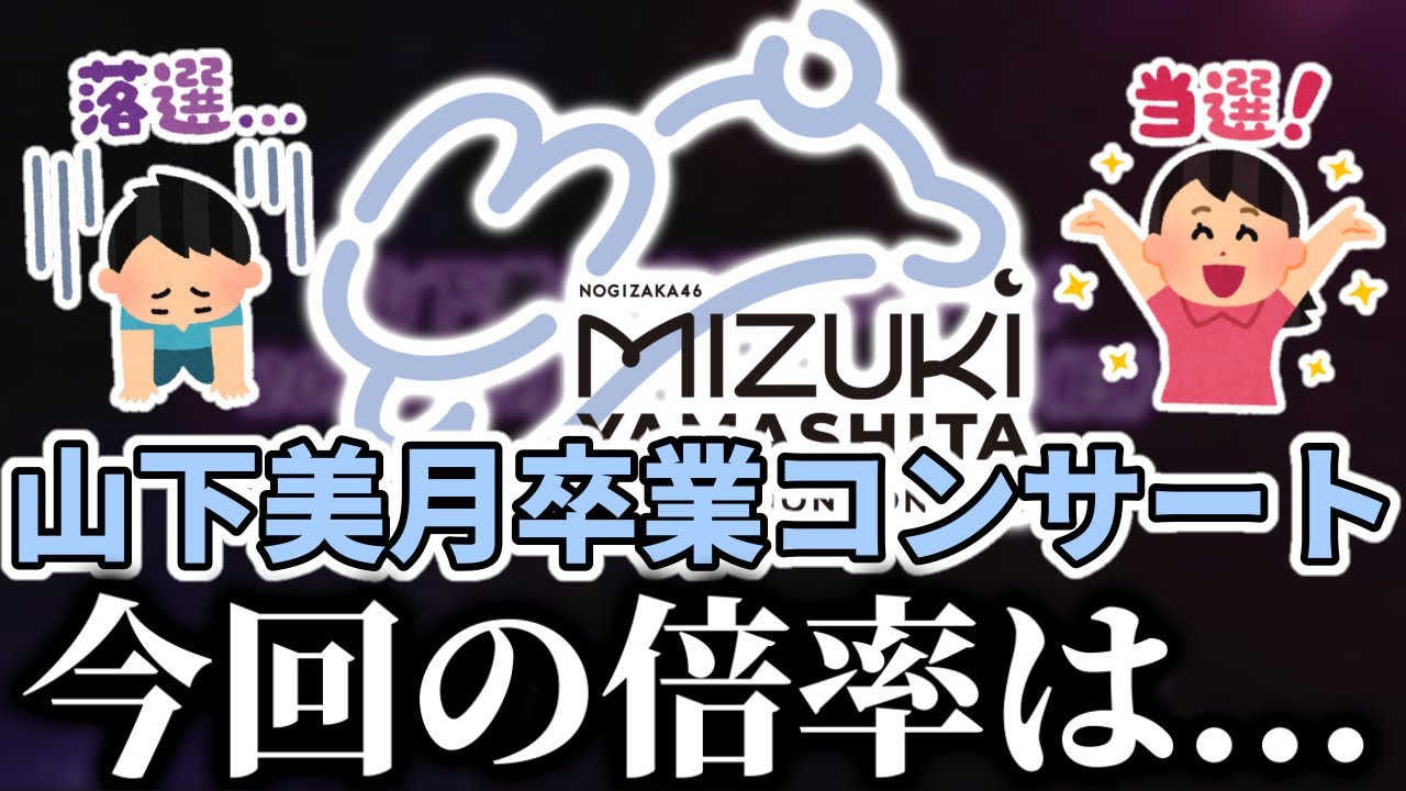 [音楽] よく言たどうもそうじゃないそうですと いうことで今回はですね昨日3月29日 山下水希卒業コンサートチケット先行の 騰落日でしたよということで応募した人ね みんなそれぞれ騰落出たかなと思うんです けどもこれで出てない人いたらおかしい からね騰落日に騰落出てない人いたら おかしいから全員騰落がねえ応募した人は 出たかなと思うし僕もね騰落動画出したん でまだね見てない人はねよかったら見て 欲しいんですけどもま騰落出たっていう ことでま今回のねこの1番最初の山下水 卒業コンサートチケット先行の倍率どんな 感じだったのかなっていうま具体的なね 数字とかは全くわかんないんですけどこう 体感でというかこう倍率どんな感じだった のかなっていうのをちょっとね今回は話し ていきたいなと思いますまず僕はね僕は6 個応募してま全部ですねえ今回モバイル 先行モバイル乃ドガ先行乃木ドガ プレミアムシード先行っていうねえ3つの 先行から応募できたんでで2日間という ことで全部で6個ね6口応募できたと思う んですけど僕は全部6口応募して1つ 当たりましたよっていうえそういう感じ だったんですけどま今回はね意外とま もちろんまそもそもねまずやっぱ水希ソコ ですからもうそもそも倍率低いってことは ないと思うんですよやっぱりたくさんねえ 全落ちの人もいただろうしま僕もなんなら 落選はしてるわけじゃないですから倍率低 いってことはないと思うもうそもそも なんかもう東大のテストみたいなねもう めちゃめちゃ高いレベルでこうやってる みたいな感じで本当にもう水希のソコなん でそのそもそもの基準が高いというかさ そもそも倍率が低いなんてことはねえない とは思うんですけどまその中でも意外と 今回は当選してる人が多かったのかなって いうイメージま2日間今回山下水卒業 コンサートライブ2日間ある中でまどっち かは1日目2日目えどっちかは当選してる 人がこう多いイメージではありましたね 結構Twitterとかこういろんなね人 の登録見てるとでもねそのTwitter とかって本当一部の人しかねツイートして ないわけじゃないですかもちろん Twitterとかやってないね自分だけ でさ何もねSNSやってないで応募してえ ま全落ちした人もいたりとかね当選したり 1人もいるわけだから全然そこは分かん ないですけど一部ではあるんですけどま その感じを見るとこう意外と当選が多かっ たのかなってどっちか1日はこう当選した