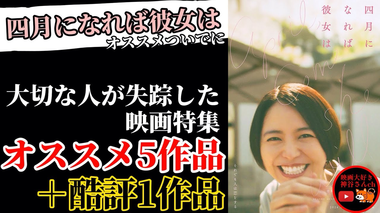 今日も聞きに来てくれてありがとうござい ます今日はねちょっといつもと変わって 新作映画じゃないんですけど映画をね6本 ぐらい紹介したいと思って動画撮ってます でですね4月になれば彼女はという新作 映画を先日見たんですけどそれが面白かっ たので他の動画映画紹介いつもやってるね レギュラーの映画紹介の動画でお勧めし てるんでもしねまだそれを見てない人は そちらも見てもらいたいんですけどでね4 月になれば彼女を見てくれた人そして映画 も実際見てるよっていう人の中であの同じ 気持ち思った人何人かいると思うんです けどあまた失踪かって思ったんですよね僕 は失踪する映が多いなと思って別にそれが 悪いとかって言わけじゃないんですけど やっぱ失踪する映画ってま定期的に作ら れるしなんで失踪したのかなっていう ところがやっぱこう疑問に思うっていうか やっぱ気になるところなので題材にもし やすいっていうか物語になりやすいのかな と思ってま確かにそうだなと思ってで え今回ねま4月になれば彼女はをおすめ 応援したい気持ちもありますのでその ついでにね今まで見た過去作の中で失踪 する人が大切な人が失踪した映画おすめ5 作品プラスおすめじゃない作品1作品計6 作品を紹介したいと思います映画大好き かやさんチャンネルグッドボタン チャンネル登録よろしくねまず1つ目いこ この作品は2023年12月8日公開で 上映時間126分となっておりますね去年 の年末ですね杉崎花さん主演でえ共演が 若葉龍役君ですねでねも冒頭からこの一子 が失踪してしまうんですけどこのね一子は ね長谷川という若葉ゆ君が演じる長谷川と いう男と2人で住んでたんですけどある日 突然一子がいなくなっちゃうんですよね 仕事から長谷川が帰ってくるとでえ探す わけなんですけどその探していく中で だんだんとね一子の過去を知ることにより 一子の壮絶な人生が浮かび上がってくると いうことででその一子のね過去なんで何が あったのか今までどういう人生を歩んでき たのか そしてね子はこれからどうするつもりなの か長川は一子と会えるのか色々なねテーマ が込められていてね社会制度だったり福祉 の問題だったり戸籍の問題だったりま様々 なテーマが盛り込まれてはっきり言って ちょっとモヤモヤする作品ではあります けどやはりねストーリーがねちょっと暗め の作品にはなってしまいますがすごくよた 作品なのでもしよかったら僕のね過去動画 に1コの紹介動画あるのでまだねそれ聞い