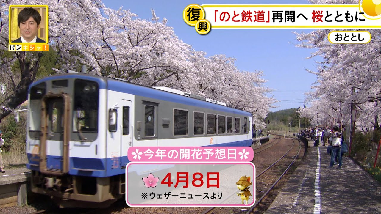 私は今の鉄道の鹿島駅にいます私の後ろに あるのがピンク色のレトロな駅舎ですここ は無人駅で駅員の方はいないんですが地元 の方が丁寧に使ってきましたそしてこちら の地図を見ていただくと七尾から穴水まで をつぐの鉄道七尾線その途中にあるのがの 鹿島駅です地震の影響でこちらのピンク色 の期間は一部運行が休止してましたが来週 の土曜日4月6日から前線で運行が再開さ れることになりましたそしてその再会と共 に地元の方が待ち望んでいるのがこちら桜 の開花ですかなつぼみを見てみますとまだ 硬いんですけれども所々ピンク色に色づい てきて少しずつ膨らんできているのが わかります実はこの駅は別名の桜駅という 相性でも親しまれているんです 桜の季節が来ると駅全体が桜色のトンネル に包まれますここに植えられている桜は旧 国鉄七尾線が開通した1932年に地元の 住民が開通を祝って植えたものです例年4 月の中旬にはおよそ100本の染吉野が駅 のホームを包み込むように咲き誇ります そして列車の窓からも美しい景色を楽しむ ことができ全の客が訪れます気になる今年 の開花はウェザーニュースによりますと4 月8日と予想されてい ますえそして先ほど私がいた駅の入り口 からこのように階段を上がってきたところ にあるのがこの駅のホームですホームは 地震の激しい揺れの影響で全体にひび割れ が入って亀裂も入ったということなんです えその後このように補修され今は新しく 真っ白なが引かれていますそしてホームの 脇こちらには大きなボンボが設置されまし たえこれは今日の午前中に地元の方々が 設置したものなんですはい後ろさん地元の 皆さんどんな思いを込めてこのボンボリ 設置したん でしょうそうですねあの設置された方の中 には1ヶ月間避難所で生活したという方も いましたただ何十年も続けてきたボンボリ を今年も変わらずに設置することで 少しでもえ日常に戻ったように見た人に 感じてもらいたいと話していました例年 ですとボボは夜になるとライトアップされ ます今年は電気店が停電の復旧などの工事 で忙しい中なんですが一部のボンボだけで もライトアップできるよう準備が進められ ているということです地元の方々の熱い 思いで設置されたボンボリと列車が桜の トンネルを通る絶景は今年も変わらず見る ことができそうです